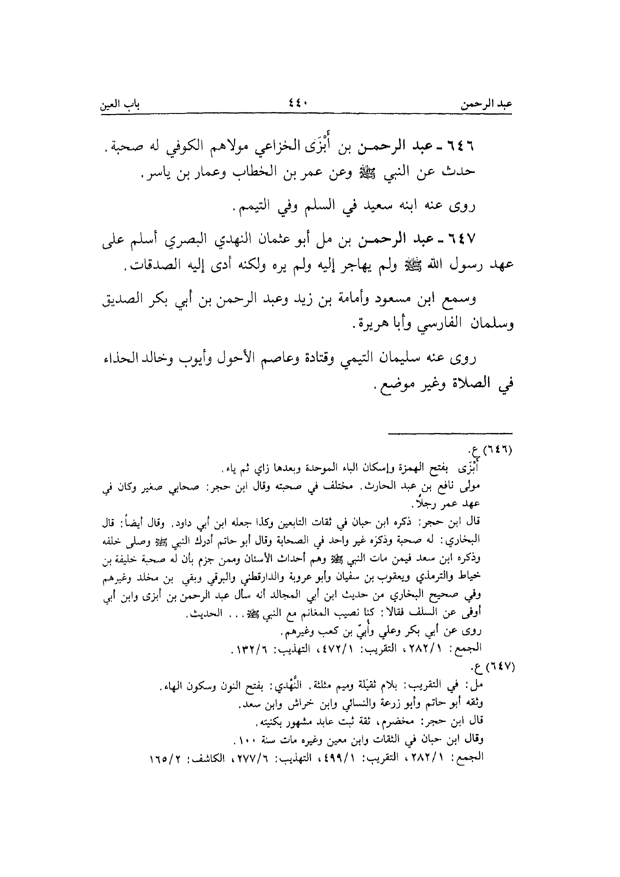 646 - عبد الرَّحْمَن بن أَبْزي الْخُزَاعِيّ مَوْلَاهُم الْكُوفِي لَهُ صُحْبَة حدث عَن النَّبِي صَلَّى الله عَلَيْهِ وَسلم وَعَن عمر بن الْخطاب وعمار بن يَاسر رَوَى عَنهُ ابْنه سعيد فِي السّلم وَفِي التَّيَمُّم