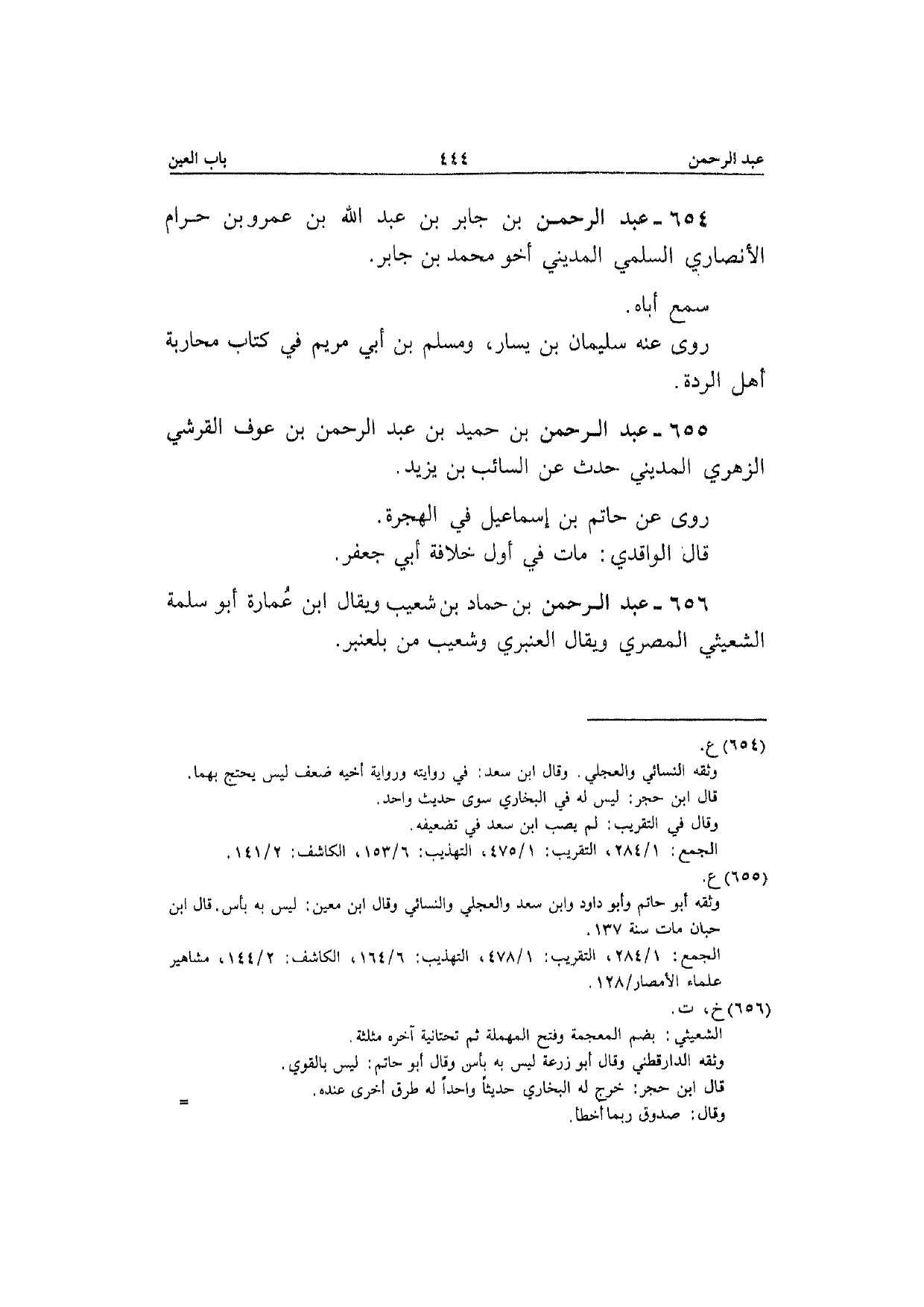 654 - عبد الرَّحْمَن بن جَابر بن عبد الله بن عَمْرو بن حرَام الْأنْصَارِيّ السّلمِيّ الْمَدِينِيّ أَخُو مُحَمَّد بن جَابر سمع أَبَاهُ رَوَى عَنهُ سُلَيْمَان بن يسَار وَمُسلم بن أبي مَرْيَم فِي كتاب محاربة أهل الرِّدَّة