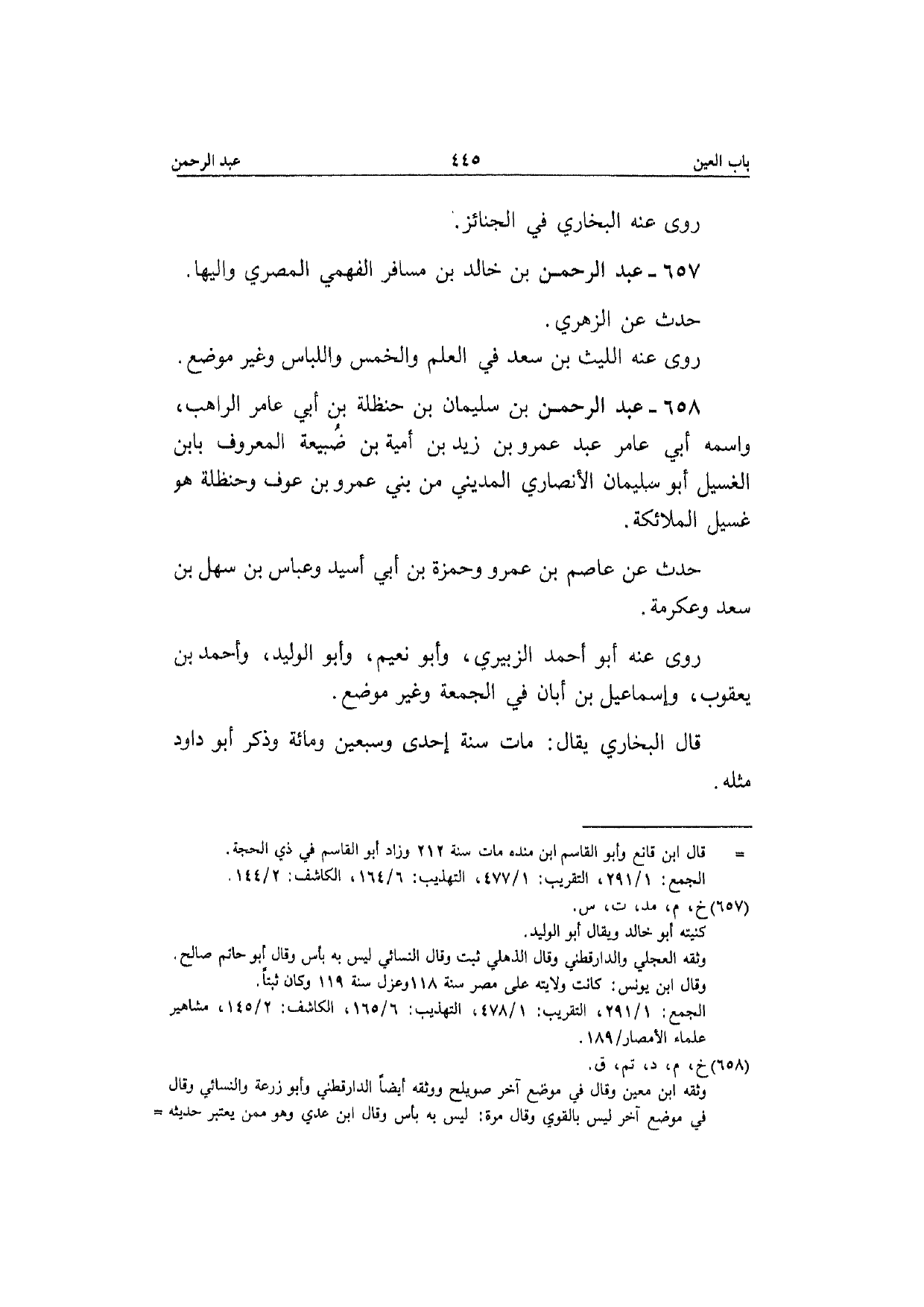 657 - عبد الرَّحْمَن بن خَالِد بن مُسَافر الفهمي الْمصْرِيّ واليها حدث عَن الزُّهْرِيّ رَوَى عَنهُ اللَّيْث بن سعد فِي الْعلم وَالْخمس واللباس وَغير مَوضِع
