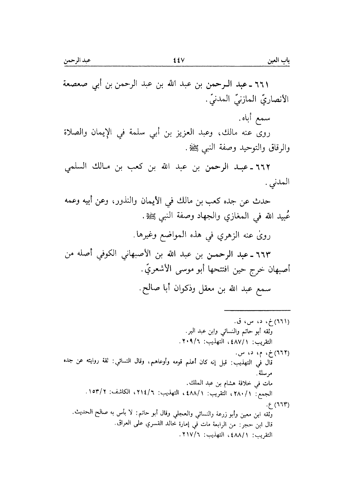 661 - عبد الرَّحْمَن بن عبد الله بن عبد الرَّحْمَن بن أبي صعصعة الْأنْصَارِيّ الْمَازِني الْمدنِي سمع أَبَاهُ رَوَى عَنهُ مَالك وَعبد الْعَزِيز بن أبي سَلمَة فِي الْإِيمَان وَالصَّلَاة والرقاق والتوحيد وَصفَة النَّبِي صَلَّى الله عَلَيْهِ وَسلم