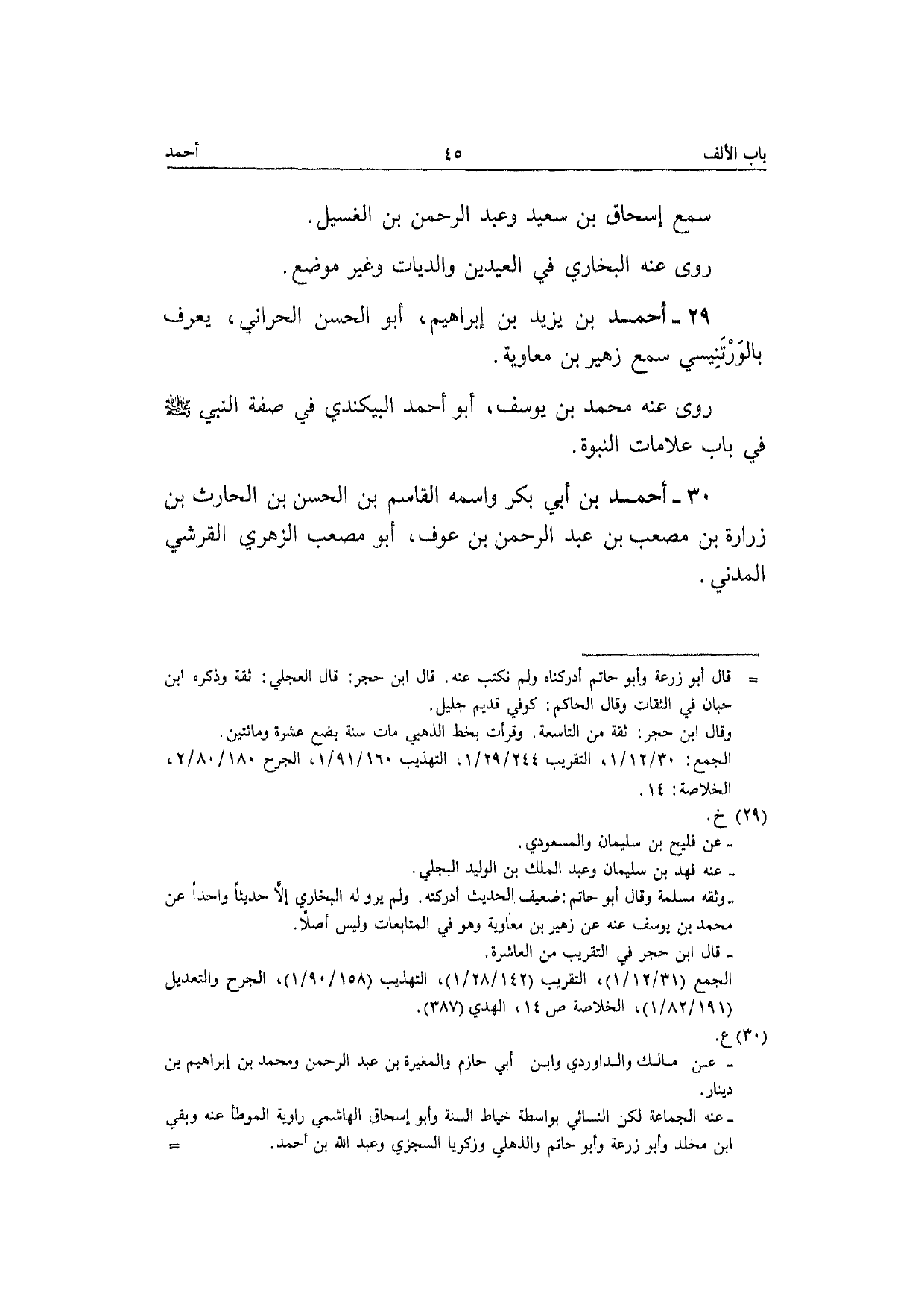 29 - أَحْمد بن يزِيد بن إِبْرَاهِيم أَبُو الْحسن الْحَرَّانِي يعرف بالورتنيسي سمع زُهَيْر بن مُعَاوِيَة رَوَى عَنهُ مُحَمَّد بن يُوسُف أَبُو أَحْمد البيكندي فِي صفة النَّبِي صَلَّى الله عَلَيْهِ وَسلم فِي بَاب عَلَامَات النُّبُوَّة