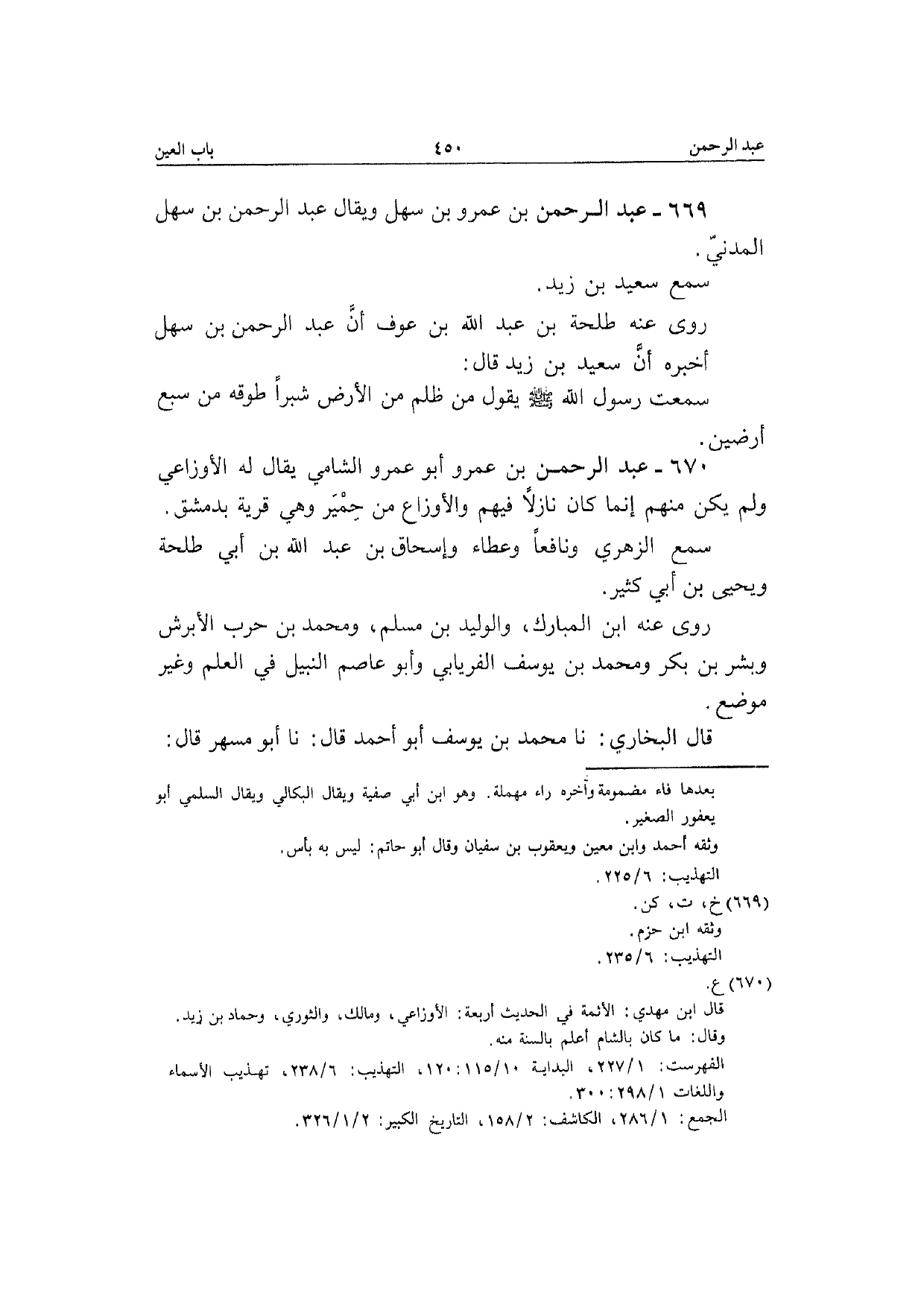 670 - عبد الرَّحْمَن بن عَمْرو أَبُو عَمْرو الشَّامي يُقَال لَهُ الْأَوْزَاعِيّ وَلم يكن مِنْهُم إِنَّمَا كَانَ نازلا فيهم والأوزاع من حمير وَهِي قَرْيَة بِدِمَشْق سمع الزُّهْرِيّ ونافعا وَعَطَاء وَإِسْحَاق بن عبد الله بن أبي طَلْحَة وَيَحْيَى بن أبي كثير رَوَى عَنهُ ابْن الْمُبَارك والوليد بن مُسلم وَمُحَمّد بن حَرْب الأبرش وَبشر بن بكر وَمُحَمّد بن يُوسُف الْفرْيَابِيّ وَأَبُو عَاصِم النَّبِيل فِي الْعلم وَغير مَوضِع قَالَ البُخَارِيّ نَا مُحَمَّد بن يُوسُف أَبُو أَحْمد قَالَ نَا أَبُو مسْهر قَالَ