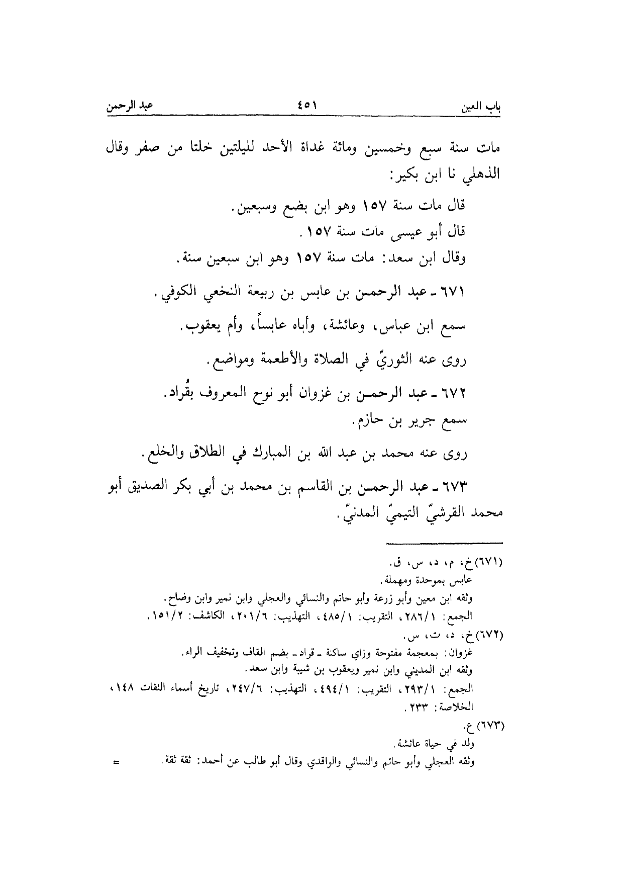 671 - عبد الرَّحْمَن بن عَابس بن ربيعَة النَّخعِيّ الْكُوفِي سمع ابْن عَبَّاس وَعَائِشَة وأباه عَابِسا وَأم يَعْقُوب رَوَى عَنهُ الثَّوْريّ فِي الصَّلَاة والأطعمة ومواضع