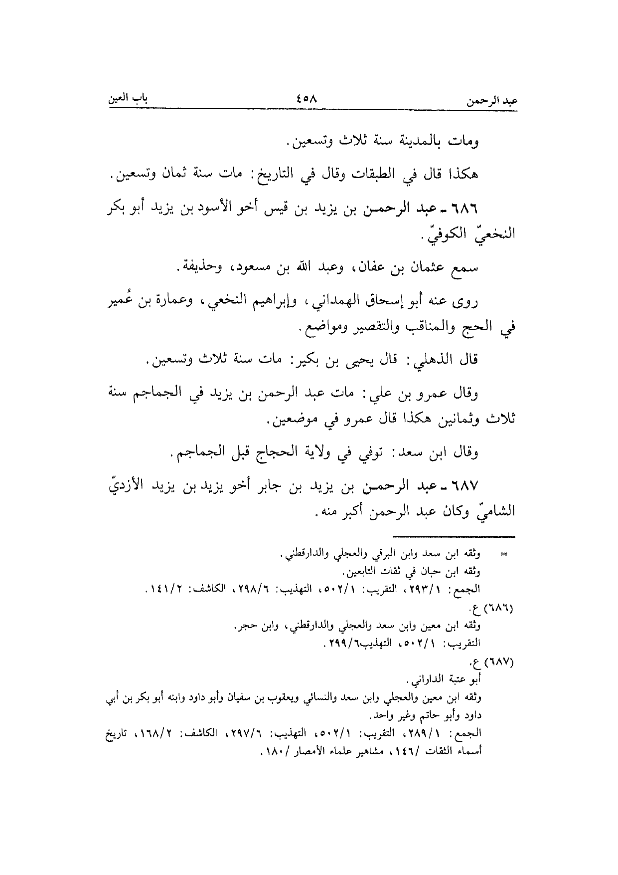 686 - عبد الرَّحْمَن بن يزِيد بن قيس أَخُو الْأسود بن يزِيد أَبُو بكر النَّخعِيّ الْكُوفِي سمع عُثْمَان بن عَفَّان وَعبد الله بن مَسْعُود وَحُذَيْفَة رَوَى عَنهُ أَبُو إِسْحَاق الْهَمدَانِي وَإِبْرَاهِيم النَّخعِيّ وَعمارَة بن عُمَيْر فِي الْحَج والمناقب وَالتَّقْصِير ومواضع قَالَ الذهلي قَالَ يَحْيَى بن بكير مَاتَ سنة ثَلَاث وَتِسْعين وَقَالَ عَمْرو بن عَلّي مَاتَ عبد الرَّحْمَن بن يزِيد فِي الجماجم سنة ثَلَاث وَثَمَانِينَ هَكَذَا قَالَ عَمْرو فِي موضِعين وَقَالَ ابْن سعد توفّي فِي ولَايَة الْحجَّاج قبل الجماجم