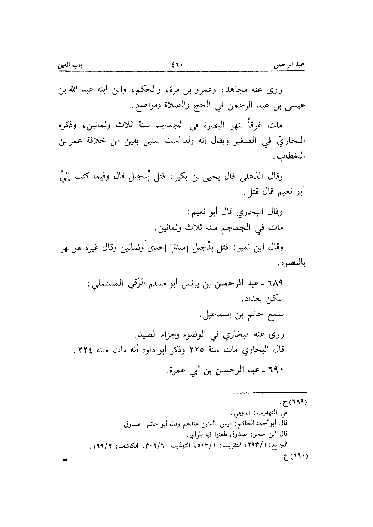 689 - عبد الرَّحْمَن بن يُونُس أَبُو مُسلم الرقي الْمُسْتَمْلِي سكن بَغْدَاد سمع حَاتِم بن إِسْمَاعِيل رَوَى عَنهُ البُخَارِيّ فِي الْوضُوء وَجَزَاء الصَّيْد قَالَ البُخَارِيّ مَاتَ سنة 225 وَذكر أَبُو دَاوُد أَنه مَاتَ سنة 224
