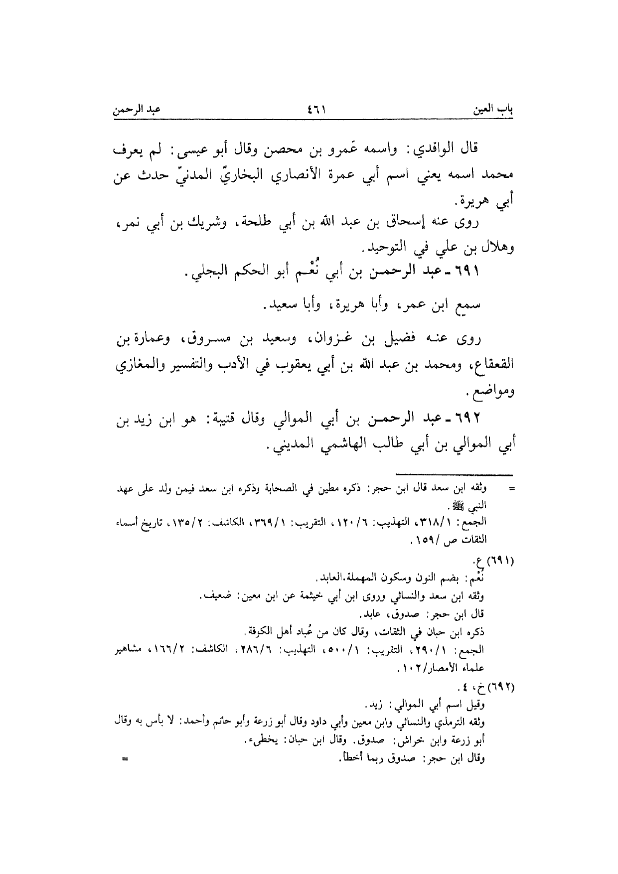 691 - عبد الرَّحْمَن بن أبي نعم أَبُو الحكم البَجلِيّ سمع ابْن عمر وَأَبا هُرَيْرَة وَأَبا سعيد رَوَى عَنهُ فُضَيْل بن غَزوَان وَسَعِيد بن مَسْرُوق وَعمارَة بن الْقَعْقَاع وَمُحَمّد بن عبد الله بن أبي يَعْقُوب فِي الْأَدَب وَالتَّفْسِير والمغازي ومواضع