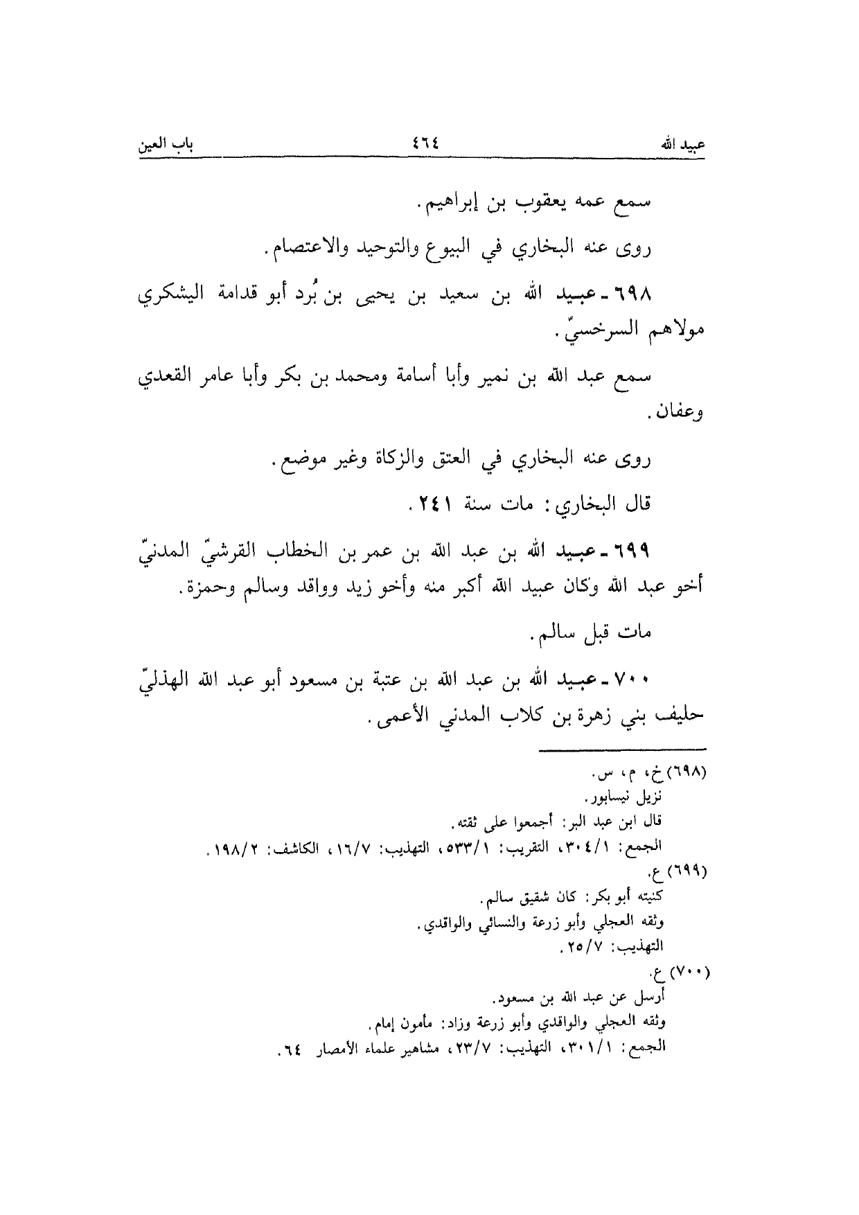 698 - عبيد الله بن سعيد بن يَحْيَى بن برد أَبُو قدامَة الْيَشْكُرِي مَوْلَاهُم السَّرخسِيّ سمع عبد الله بن نمير وَأَبا أُسَامَة وَمُحَمّد بن بكر وَأَبا عَامر القعدي وَعَفَّان رَوَى عَنهُ البُخَارِيّ فِي الْعتْق وَالزَّكَاة وَغير مَوضِع قَالَ البُخَارِيّ مَاتَ سنة 241