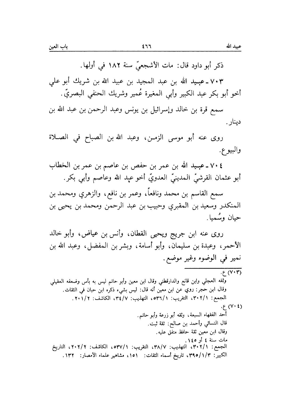703 - عبيد الله بن عبد الْمجِيد بن عبيد الله بن شريك أَبُو عَلّي أَخُو أَبُو بكر عبد الْكَبِير وَأبي الْمُغيرَة عُمَيْر وَشريك الْحَنَفِيّ الْبَصْرِيّ سمع قُرَّة بن خَالِد وَإِسْرَائِيل بن يُونُس وَعبد الرَّحْمَن بن عبد الله بن دِينَار رَوَى عَنهُ أَبُو مُوسَى الزَّمن وَعبد الله بن الصَّباح فِي الصَّلَاة والبيوع