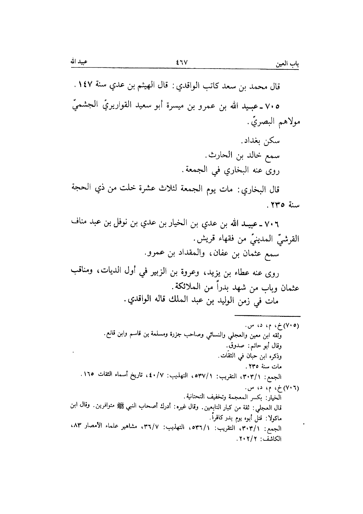 706 - عبيد الله بن عدي بن الْخِيَار بن عدي بن نَوْفَل بن عبد منَاف الْقرشِي الْمَدِينِيّ من فُقَهَاء قُرَيْش سمع عُثْمَان بن عَفَّان والمقداد بن عَمْرو رَوَى عَنهُ عَطاء بن يزِيد وَعُرْوَة بن الزبير فِي أول الدِّيات ومناقب عُثْمَان وَبَاب من شهد بَدْرًا من الْمَلَائِكَة مَاتَ فِي زمن الْوَلِيد بن عبد الْملك قَالَه الْوَاقِدِيّ