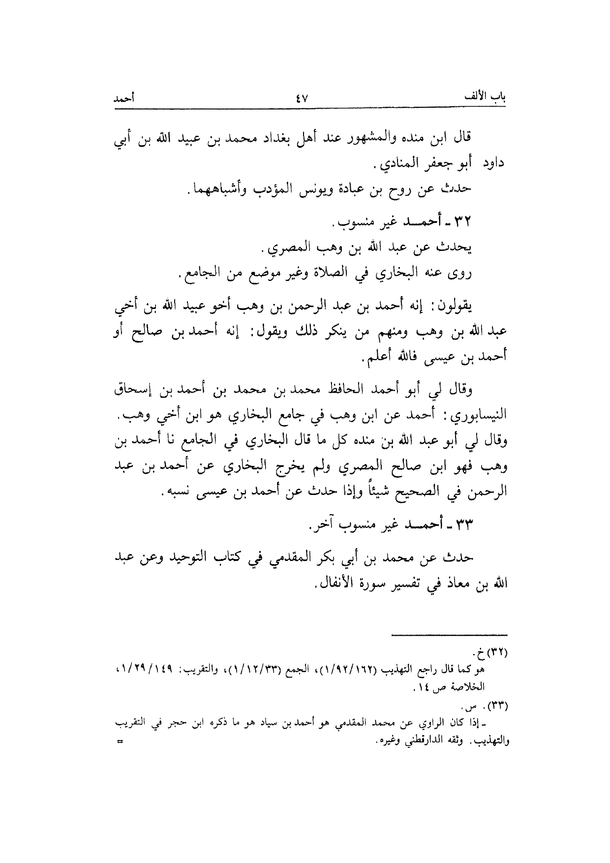33 - أَحْمد غير مَنْسُوب آخر حدث عَن مُحَمَّد بن أبي بكر الْمقدمِي فِي كتاب التَّوْحِيد وَعَن عبد الله بن معَاذ فِي تَفْسِير سُورَة الْأَنْفَال