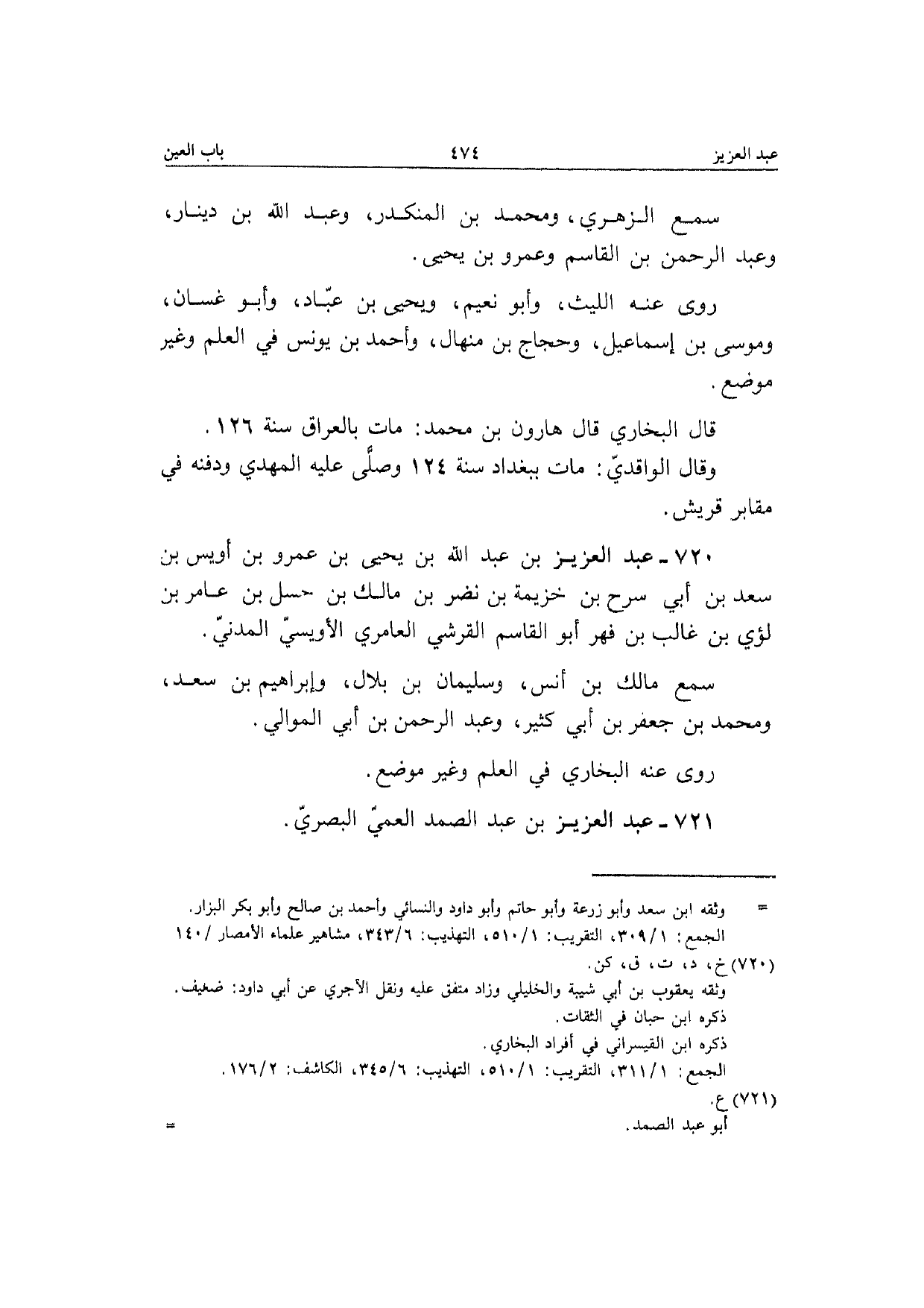 720 - عبد الْعَزِيز بن عبد الله بن يَحْيَى بن عَمْرو بن أويس بن سعد بن أبي سرح بن خُزَيْمَة بن نضر بن مَالك بن حسل بن عَامر بن لؤَي بن غَالب بن فهر أَبُو الْقَاسِم الْقرشِي العامري الأويسي الْمدنِي سمع مَالك بن أنس وَسليمَان بن بِلَال وَإِبْرَاهِيم بن سعد وَمُحَمّد بن جَعْفَر بن أبي كثير وَعبد الرَّحْمَن بن أبي الموَالِي رَوَى عَنهُ البُخَارِيّ فِي الْعلم وَغير مَوضِع
