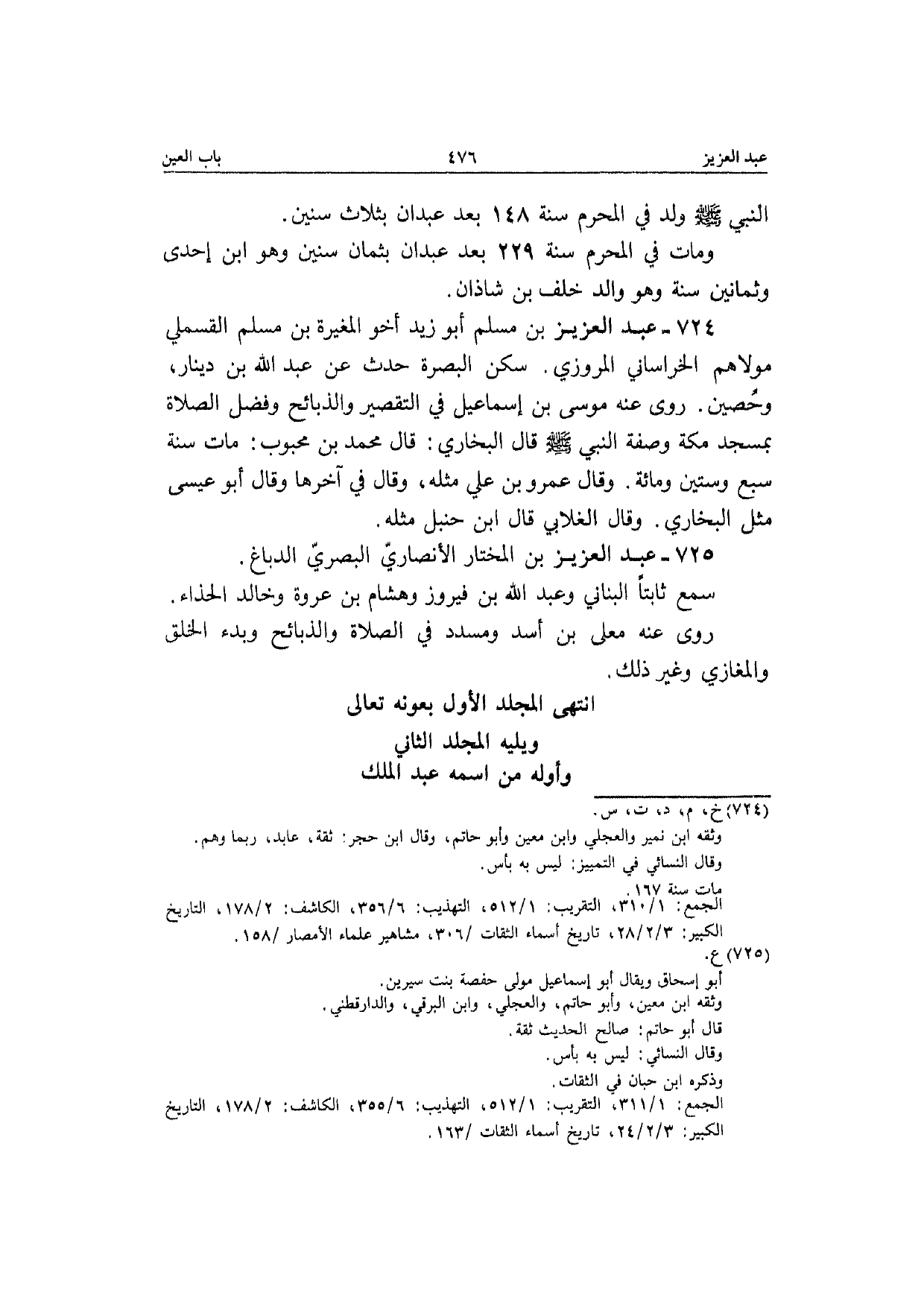725 - عبد الْعَزِيز بن الْمُخْتَار الْأنْصَارِيّ الْبَصْرِيّ الدّباغ سمع ثَابتا الْبنانِيّ وَعبد الله بن فَيْرُوز وَهِشَام بن عُرْوَة وخَالِد الْحذاء رَوَى عَنهُ مُعلى بن أَسد ومسدد فِي الصَّلَاة والذبائح وبدء الْخلف والمغازي وَغير ذَلِك انْتَهَى المجلد الأول بعونه تَعَالَى ويليه المجلد الثَّانِي وأوله من اسْمه عبد الْملك