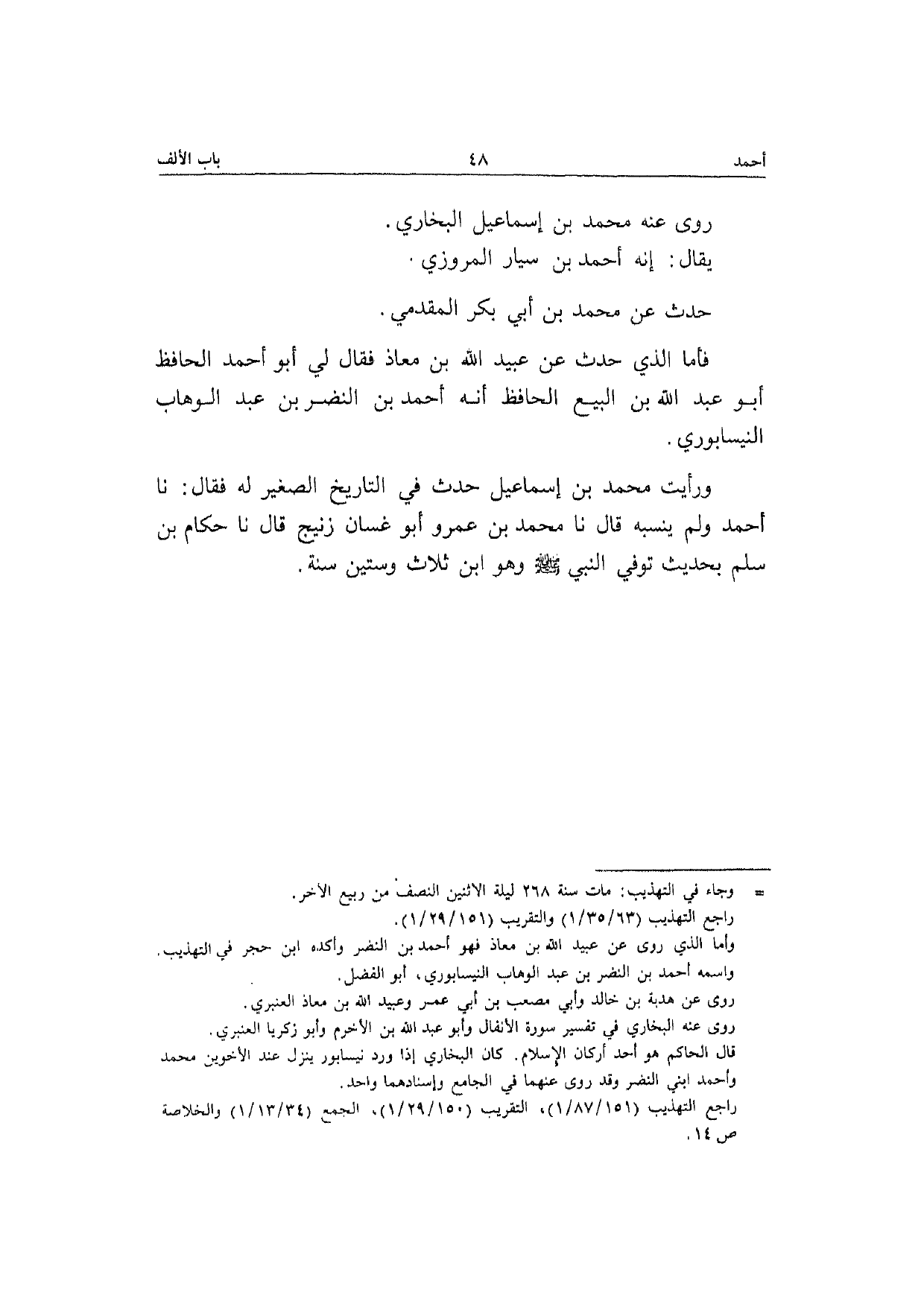 رَوَى عَنهُ مُحَمَّد بن إِسْمَاعِيل البُخَارِيّ يُقَال إِنَّه أَحْمد بن سيار الْمروزِي حدث عَن مُحَمَّد بن أبي بكر الْمقدمِي فَأَما الَّذِي حدث عَن عبيد الله بن معَاذ فَقَالَ لي أَبُو أَحْمد الْحَافِظ أَبُو عبد الله بن البيع الْحَافِظ أَنه أَحْمد بن النَّضر بن عبد الْوَهَّاب النَّيْسَابُورِي وَرَأَيْت مُحَمَّد بن إِسْمَاعِيل حدث فِي التَّارِيخ الصَّغِير لَهُ فَقَالَ نَا أَحْمد وَلم ينْسبهُ قَالَ نَا مُحَمَّد بن عَمْرو أَبُو غَسَّان زنيج قَالَ نَا حكام بن سلم بِحَدِيث توفّي النَّبِي صَلَّى الله عَلَيْهِ وَسلم وَهُوَ ابْن ثَلَاث وَسِتِّينَ سنة