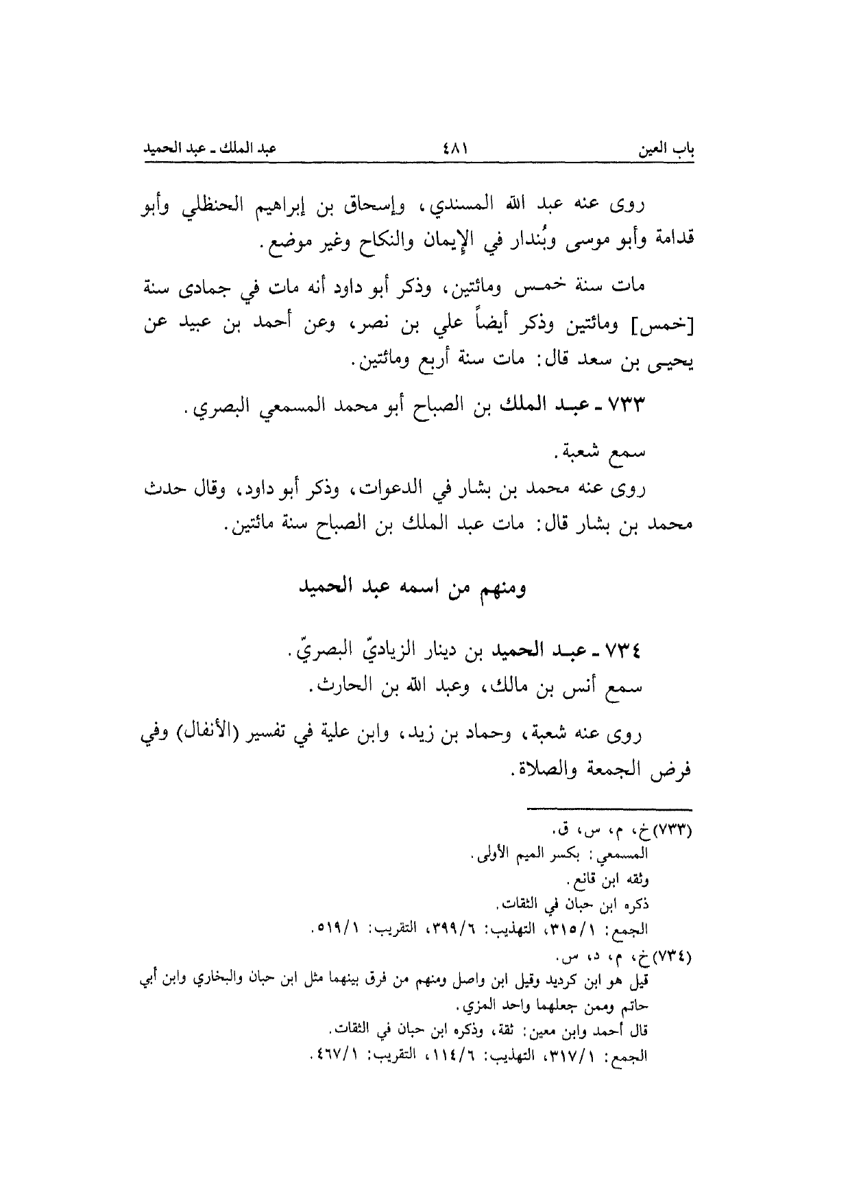 733 - عبد الْملك بن الصَّباح أَبُو مُحَمَّد المسمعي الْبَصْرِيّ سمع شُعْبَة رَوَى عَنهُ مُحَمَّد بن بشار فِي الدَّعْوَات وَذكر أَبُو دَاوُد وَقَالَ حدث مُحَمَّد بن بشار قَالَ مَاتَ عبد الْملك بن الصَّباح سنة مِائَتَيْنِ
