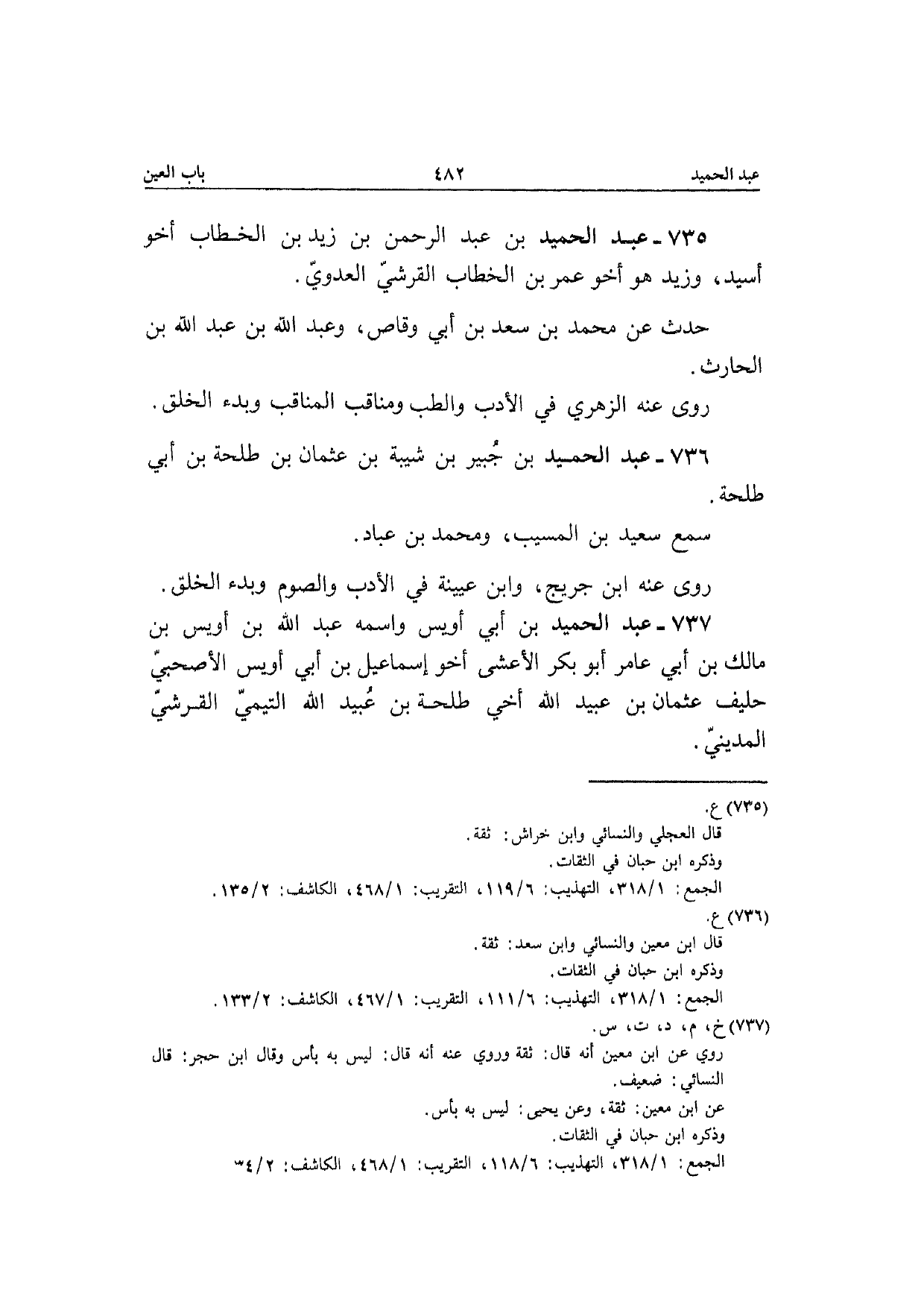 735 - عبد الحميد بن عبد الرَّحْمَن بن زيد بن الْخطاب أَخُو أسيد وَزيد هُوَ أَخُو عمر بن الْخطاب الْقرشِي الْعَدوي حدث عَن مُحَمَّد بن سعد بن أبي وَقاص وَعبد الله بن عبد الله بن الْحَارِث رَوَى عَنهُ الزُّهْرِيّ فِي الْأَدَب والطب والمناقب وبدء الْخلق