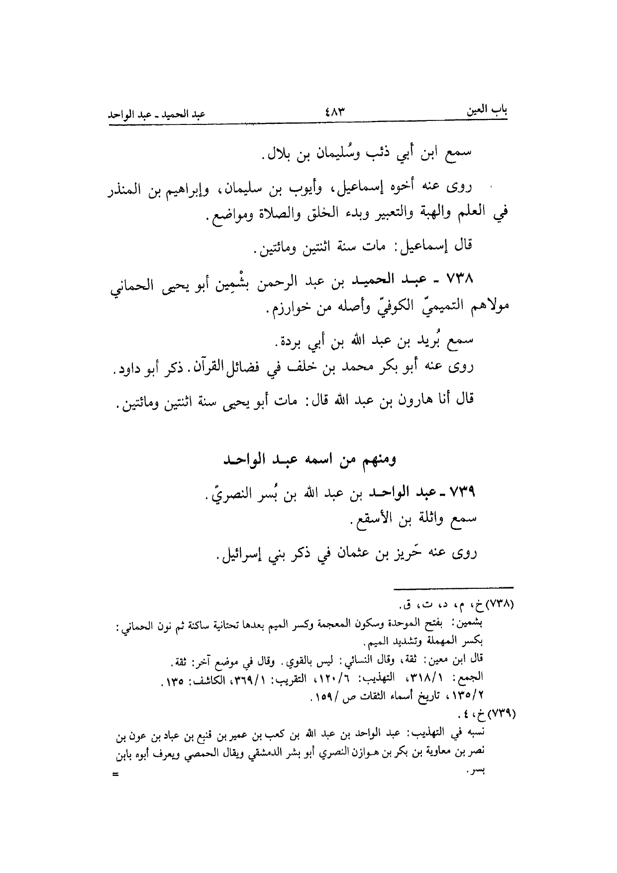 739 - عبد الْوَاحِد بن عبد الله بن بسر النصري سمع وائلة بن الْأَسْقَع رَوَى عَنهُ حريز بن عُثْمَان فِي ذكر بني إِسْرَائِيل
