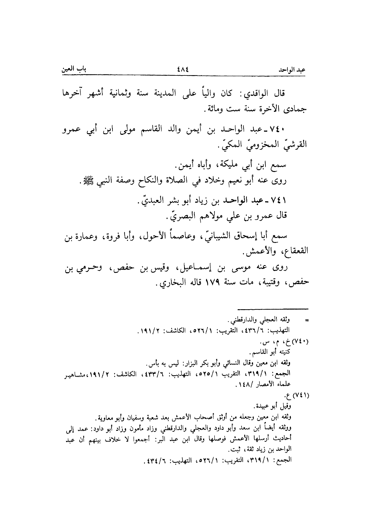 740 - عبد الْوَاحِد بن أَيمن وَالِد الْقَاسِم مولَى ابْن أبي عَمْرو الْقرشِي المَخْزُومِي الْمَكِّيّ سمع ابْن أبي ملكية وأباه أَيمن رَوَى عَنهُ أَبُو نعيم وخلاد فِي الصَّلَاة وَالنِّكَاح وَصفَة النَّبِي صَلَّى الله عَلَيْهِ وَسلم