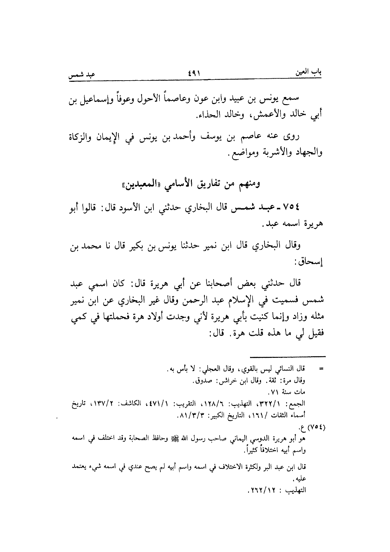 754 - عبد شمس قَالَ البُخَارِيّ حَدثنِي ابْن الْأسود قَالَ قَالُوا أَبُو هُرَيْرَة اسْمه عبد وَقَالَ البُخَارِيّ قَالَ ابْن نمير حَدثنَا يُونُس بن بكير قَالَ نَا مُحَمَّد بن إِسْحَاق قَالَ حَدثنِي بعض أَصْحَابنَا عَن أبي هُرَيْرَة قَالَ كَانَ اسْمِي عبد شمس فسميت فِي الْإِسْلَام عبد الرَّحْمَن وَقَالَ غير البُخَارِيّ عَن ابْن نمير مثله وَزَاد وَإِنَّمَا كنيت بِأبي هُرَيْرَة لِأَنِّي وجدت أَوْلَاد هرة فحملتها فِي كمي فَقيل لي مَا هَذِه قلت هرة قَالَ