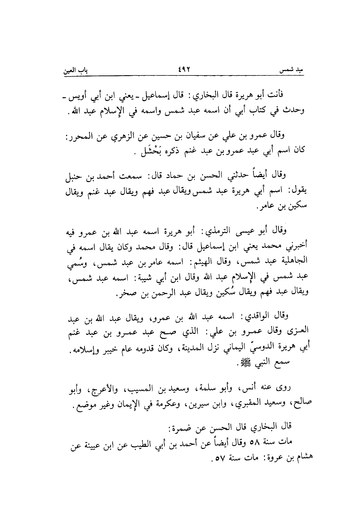 فَأَنت أَبُو هُرَيْرَة قَالَ البُخَارِيّ قَالَ إِسْمَاعِيل يَعْنِي ابْن أبي أويس وَحدث فِي كتاب أبي أَن اسْمه عبد شمس واسْمه فِي الْإِسْلَام عبد الله وَقَالَ عَمْرو ابْن عَلّي عَن سُفْيَان بن حُسَيْن عَن الزُّهْرِيّ عَن الْمُحَرر كَانَ اسْم أبي عبد عَمْرو ابْن عبد غنم ذكره بحشل وَقَالَ أَيْضا حَدثنِي الْحسن بن حَمَّاد قَالَ سَمِعت أَحْمد ابْن حَنْبَل يَقُول اسْم أبي هُرَيْرَة عبد شمس وَيُقَال عبد فهم وَيُقَال عبد غنم وَيُقَال سكين بن عَامر وَقَالَ أَبُو عِيسَى التِّرْمِذِيّ أَبُو هُرَيْرَة اسْمه عبد الله ابْن عَمْرو فِيهِ أَخْبرنِي مُحَمَّد يَعْنِي ابْن إِسْمَاعِيل قَالَ وَقَالَ مُحَمَّد وَكَانَ يُقَال اسْمه فِي الْجَاهِلِيَّة عبد شمس وَقَالَ الْهَيْثَم اسْمه عَامر بن عبد شمس وَسمي عبد شمس فِي الْإِسْلَام عبد الله وَقَالَ ابْن أبي شيبَة اسْمه عبد شمس وَيُقَال عبد فهم وَيُقَال سكين وَيُقَال عبد الرَّحْمَن بن صَخْر وَقَالَ الْوَاقِدِيّ اسْمه عبد الله بن عَمْرو وَيُقَال عبد الله بن عبد الْعُزَّى وَقَالَ عَمْرو بن عَلّي الَّذِي صَحَّ عبد عَمْرو بن عبد غنم أبي هُرَيْرَة الدوسي الْيَمَانِيّ نزل الْمَدِينَة وَكَانَ قدومه عَام خَيْبَر وإسلامه سمع النَّبِي صَلَّى الله عَلَيْهِ وَسلم رَوَى عَنهُ أنس وَأَبُو سَلمَة وَسَعِيد بن الْمسيب والأعرج وَأَبُو صَالح وَسَعِيد المَقْبُري وَابْن سِيرِين وَعِكْرِمَة فِي الْإِيمَان وَغير مَوضِع قَالَ البُخَارِيّ قَالَ الْحسن عَن ضَمرَة مَاتَ سنة 58 وَقَالَ أَيْضا عَن أَحْمد بن أبي الطّيب عَن ابْن عُيَيْنَة عَن هِشَام بن عُرْوَة مَاتَ سنة 57