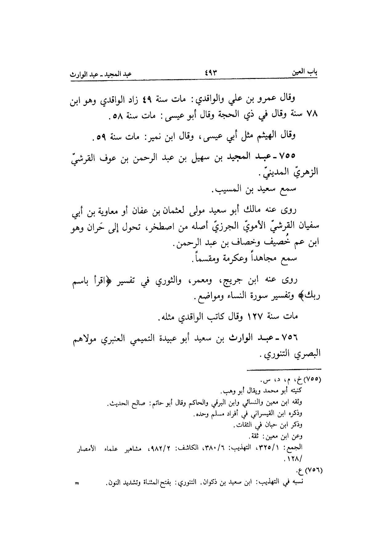 755 - عبد الْمجِيد بن سُهَيْل بن عبد الرَّحْمَن بن عَوْف الْقرشِي الزُّهْرِيّ الْمَدِينِيّ سمع سعيد بن الْمسيب رَوَى عَنهُ مَالك أَبُو سعيد مولَى لعُثْمَان بن عَفَّان أَو مُعَاوِيَة ابْن أبي سُفْيَان الْقرشِي الْأمَوِي الْجَزرِي أَصله من أصطخر تحول إِلَى حران وَهُوَ ابْن عَم خصيف وخصاف بن عبد الرَّحْمَن سمع مُجَاهدًا وَعِكْرِمَة ومقسما رَوَى عَنهُ ابْن جريج وَمعمر وَالثَّوْري فِي تَفْسِير (اقْرَأ باسم رَبك) وَتَفْسِير سُورَة النِّسَاء ومواضع مَاتَ سنة 127 وَقَالَ كَاتب الْوَاقِدِيّ مثله