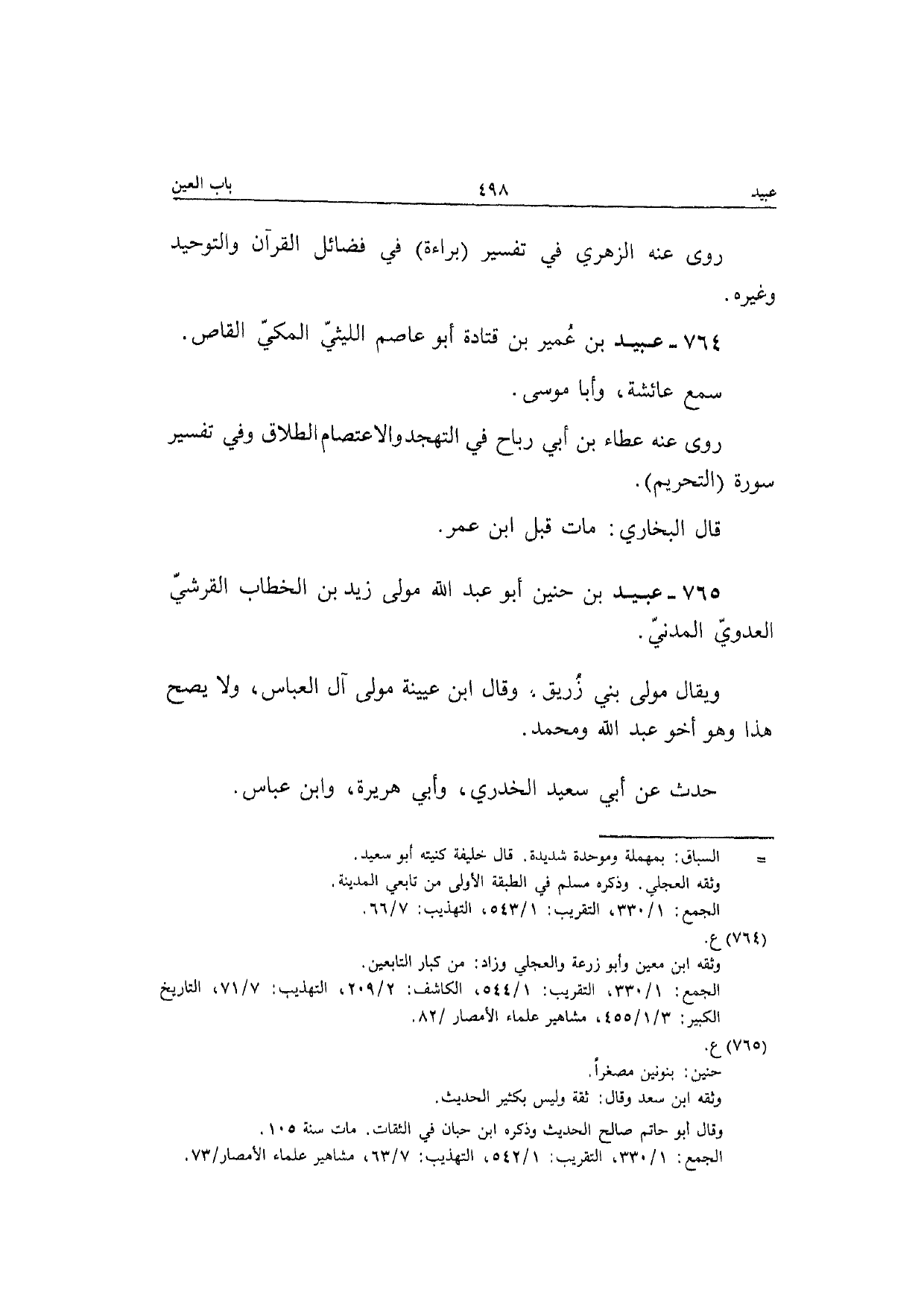 765 - عبيد بن حنين أَبُو عبد الله مولَى زيد بن الْخطاب الْقرشِي الْعَدوي الْمدنِي وَيُقَال مولَى بني زُرَيْق وَقَالَ ابْن عُيَيْنَة مولَى آل الْعَبَّاس وَلَا يَصح هَذَا وَهُوَ أَخُو عبد الله وَمُحَمّد حدث عَن أبي سعيد الْخُدْرِيّ وَأبي هُرَيْرَة وَابْن عَبَّاس