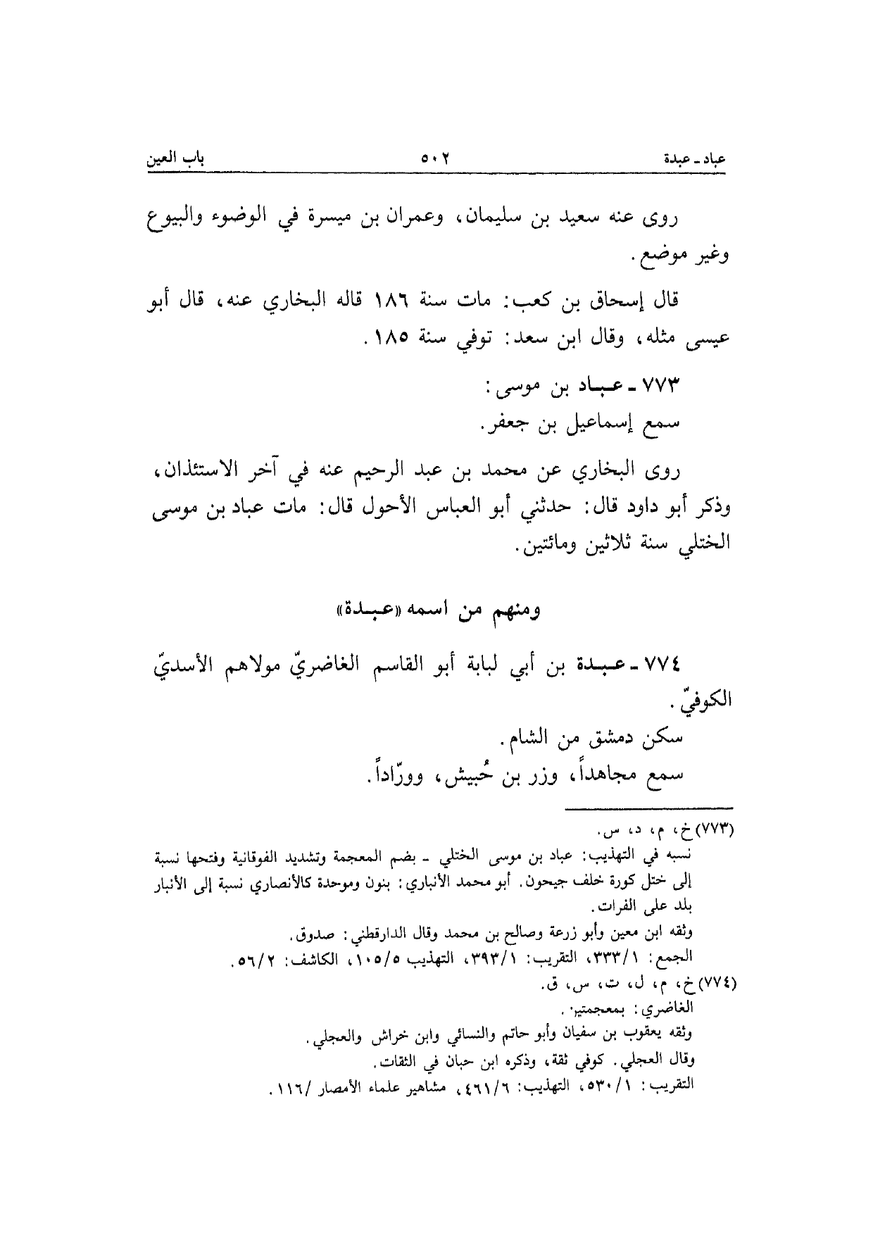 773 - عباد بن مُوسَى سمع إِسْمَاعِيل بن جَعْفَر رَوَى البُخَارِيّ عَن مُحَمَّد بن عبد الرَّحِيم عَنهُ فِي آخر الاسْتِئْذَان وَذكر أَبُو دَاوُد قَالَ حَدثنِي أَبُو الْعَبَّاس الْأَحول قَالَ مَاتَ عباد بن مُوسَى الْخُتلِي سنة ثَلَاثِينَ وَمِائَتَيْنِ