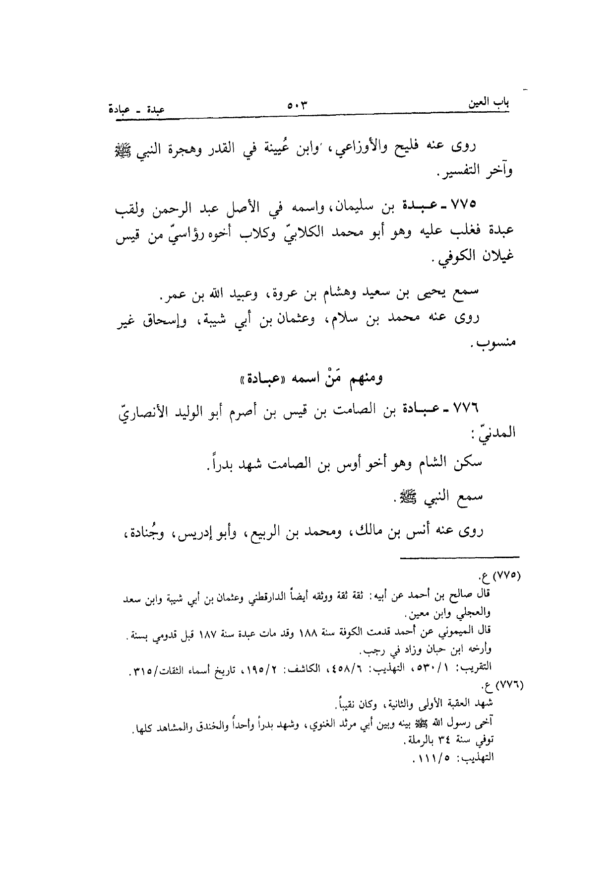 775 - عَبدة بن سُلَيْمَان واسْمه فِي الأَصْل عبد الرَّحْمَن ولقب عَبدة فغلب عَلَيْهِ وَهُوَ أَبُو مُحَمَّد الْكلابِي وكلاب أَخُوهُ رؤاسي من قيس غيلَان الْكُوفِي سمع يَحْيَى بن سعيد وَهِشَام بن عُرْوَة وَعبيد الله بن عمر رَوَى عَنهُ مُحَمَّد بن سَلام وَعُثْمَان بن أبي شيبَة وَإِسْحَاق غير مَنْسُوب