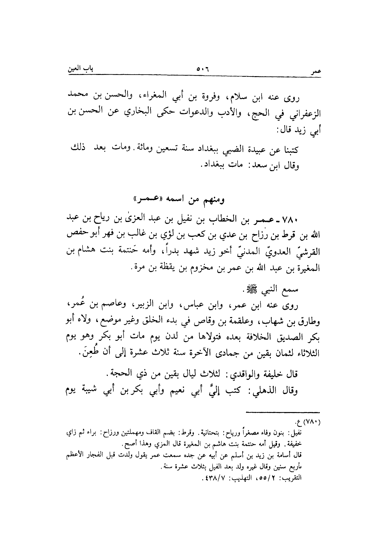 780 - عمر بن الْخطاب بن نفَيْل بن عبد الْعُزَّى بن رَبَاح بن عبد الله بن قرط بن رزاح بن عدي بن كَعْب بن لؤَي بن غَالب بن فهر أَبُو حَفْص الْقرشِي الْعَدوي الْمدنِي أَخُو زيد شهد بَدْرًا وَأمه حنتمة بنت هِشَام بن الْمُغيرَة بن عبد الله بن عمر بن مَخْزُوم بن يقظة بن مرّة سمع النَّبِي صَلَّى الله عَلَيْهِ وَسلم رَوَى عَنهُ ابْن عمر وَابْن عَبَّاس وَابْن الزبير وَعَاصِم بن عمر وطارق بن شهَاب وعلقمة بن وَقاص فِي بَدْء الْخلق وَغير مَوضِع ولاه أَبُو بكر الصّديق الْخلَافَة بعده فتولاها من لدن يَوْم مَاتَ أَبُو بكر وَهُوَ يَوْم الثُّلَاثَاء لثمان بَقينَ من جُمَادَى الْآخِرَة سنة ثَلَاث عشرَة إِلَى أَن طعن قَالَ خَليفَة والواقدي لثلاث لَيَال بَقينَ من ذِي الْحجَّة وَقَالَ الذهلي كتب إِلَيّ أبي نعيم وَأبي بكر بن أبي شيبَة يَوْم