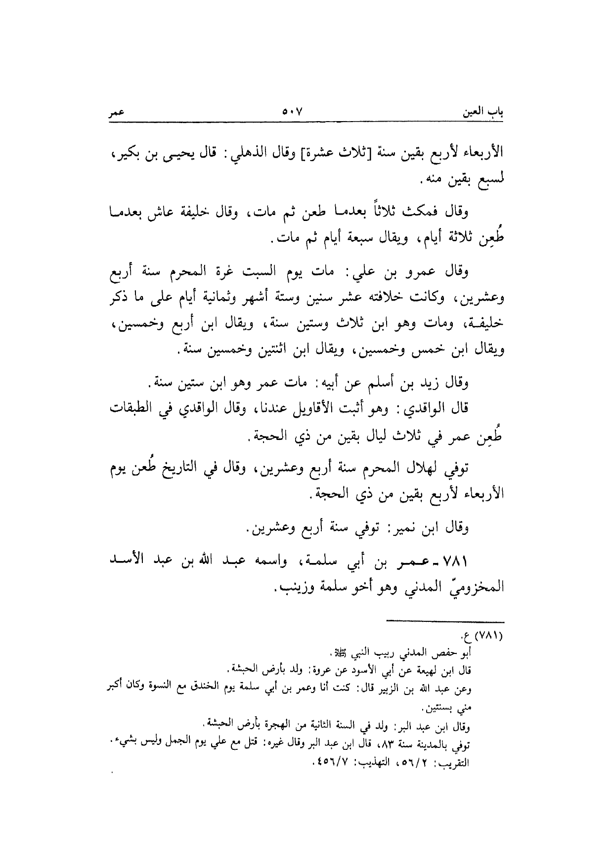781 - عمر بن أبي سَلمَة واسْمه عبد الله بن عبد الْأسد المَخْزُومِي الْمدنِي وَهُوَ أَخُو سَلمَة وَزَيْنَب
