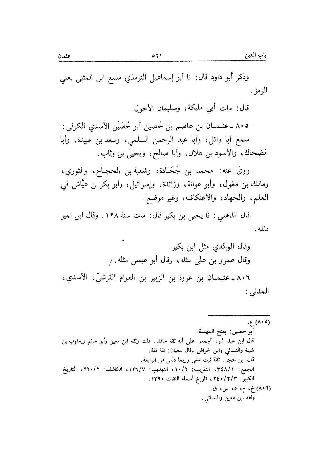 805 - عُثْمَان بن عَاصِم بن حُصَيْن أَبُو حُصَيْن الْأَسدي الْكُوفِي سمع أَبَا وَائِل وَأَبا عبد الرَّحْمَن السّلمِيّ وَسعد بن عُبَيْدَة وَأَبا الضَّحَّاك وَالْأسود بن هِلَال وَأَبا صَالح وَيَحْيَى بن وثاب رَوَى عَنهُ مُحَمَّد بن جحادة وَشعْبَة بن الْحجَّاج وَالثَّوْري وَمَالك بن مغول وَأَبُو عوَانَة وزائدة وَإِسْرَائِيل وَأَبُو بكر بن عَيَّاش فِي الْعلم وَالْجهَاد وَالِاعْتِكَاف وَغير مَوضِع قَالَ الذهلي نَا يَحْيَى بن بكير قَالَ مَاتَ سنة 128 وَقَالَ ابْن نمير مثله وَقَالَ الْوَاقِدِيّ مثل ابْن بكير وَقَالَ عَمْرو بن عَلّي مثله وَقَالَ أَبُو عِيسَى مثله