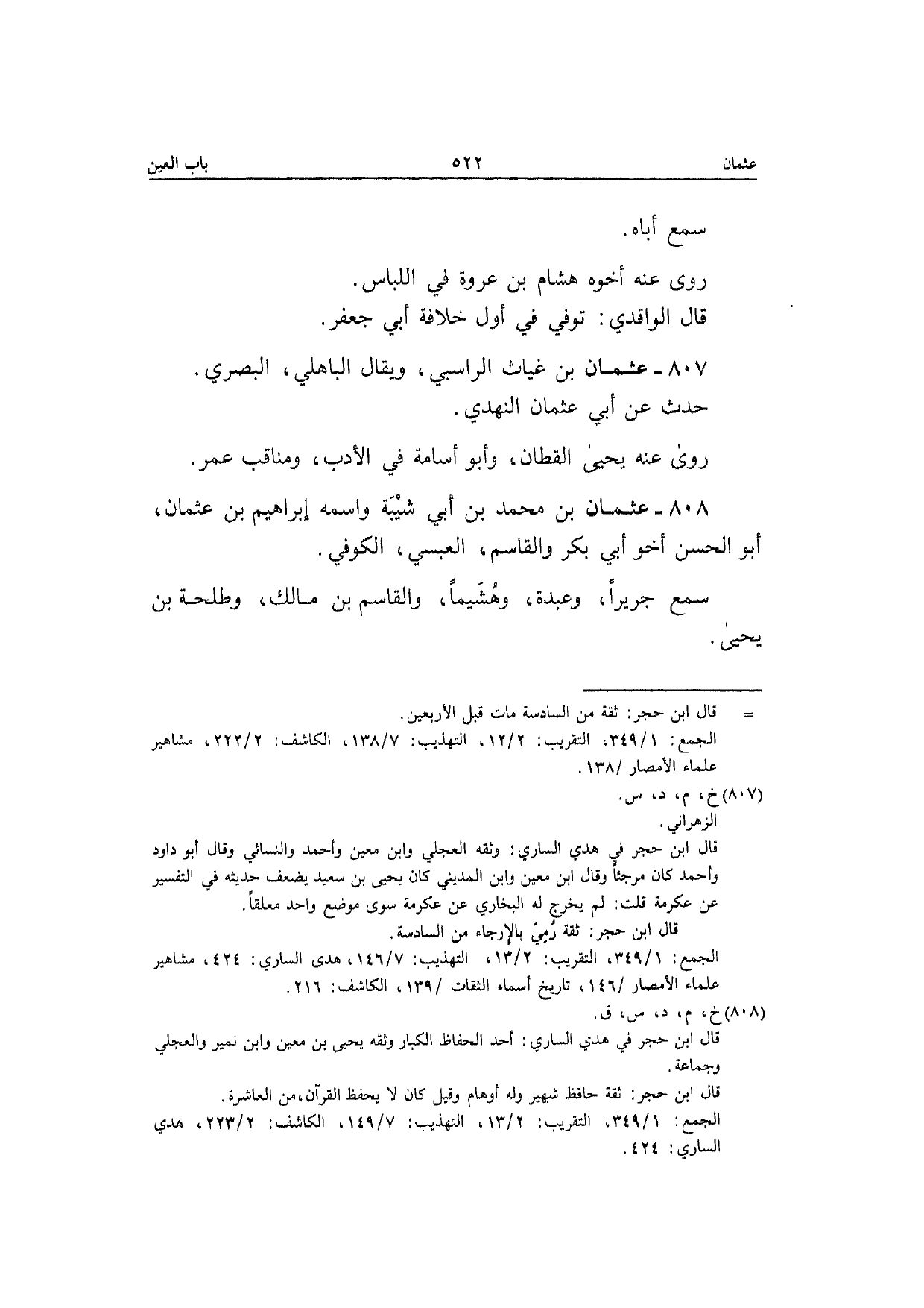 808 - عُثْمَان بن مُحَمَّد بن أبي شيبَة واسْمه إِبْرَاهِيم بن عُثْمَان أَبُو الْحسن أَخُو أبي بكر وَالقَاسِم الْعَبْسِي الْكُوفِي سمع جَرِيرًا وَعَبدَة وهشيما وَالقَاسِم بن مَالك وَطَلْحَة بن يَحْيَى