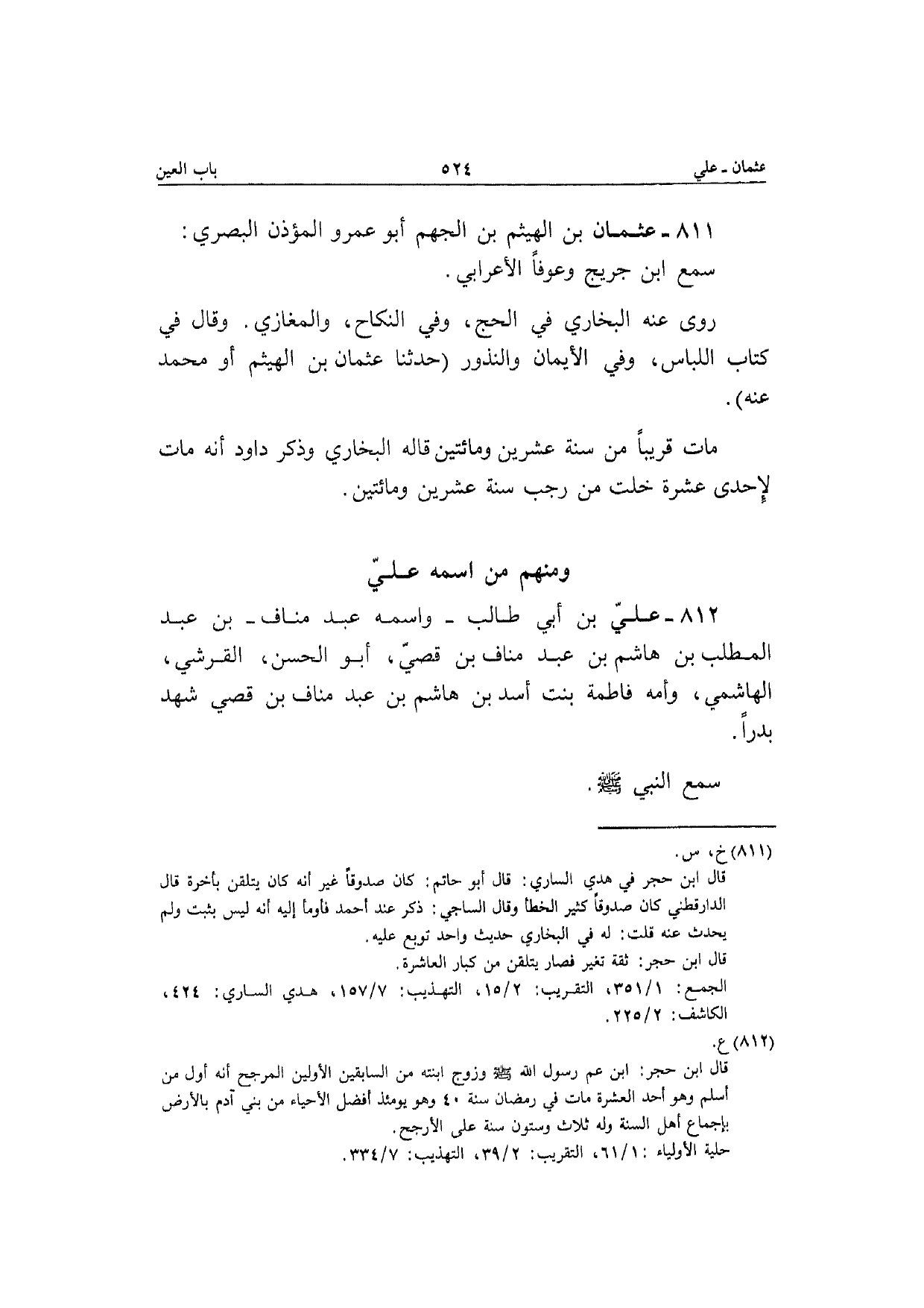 812 - عَلّي بن أبي طَالب واسْمه عبد منَاف بن عبد الْمطلب بن هَاشم بن عبد منَاف بن قصي أَبُو الْحسن الْقرشِي الْهَاشِمِي وَأمه فَاطِمَة بنت أَسد بن هَاشم بن عبد المناف بن قصي شهد بَدْرًا سمع النَّبِي صَلَّى الله عَلَيْهِ وَسلم