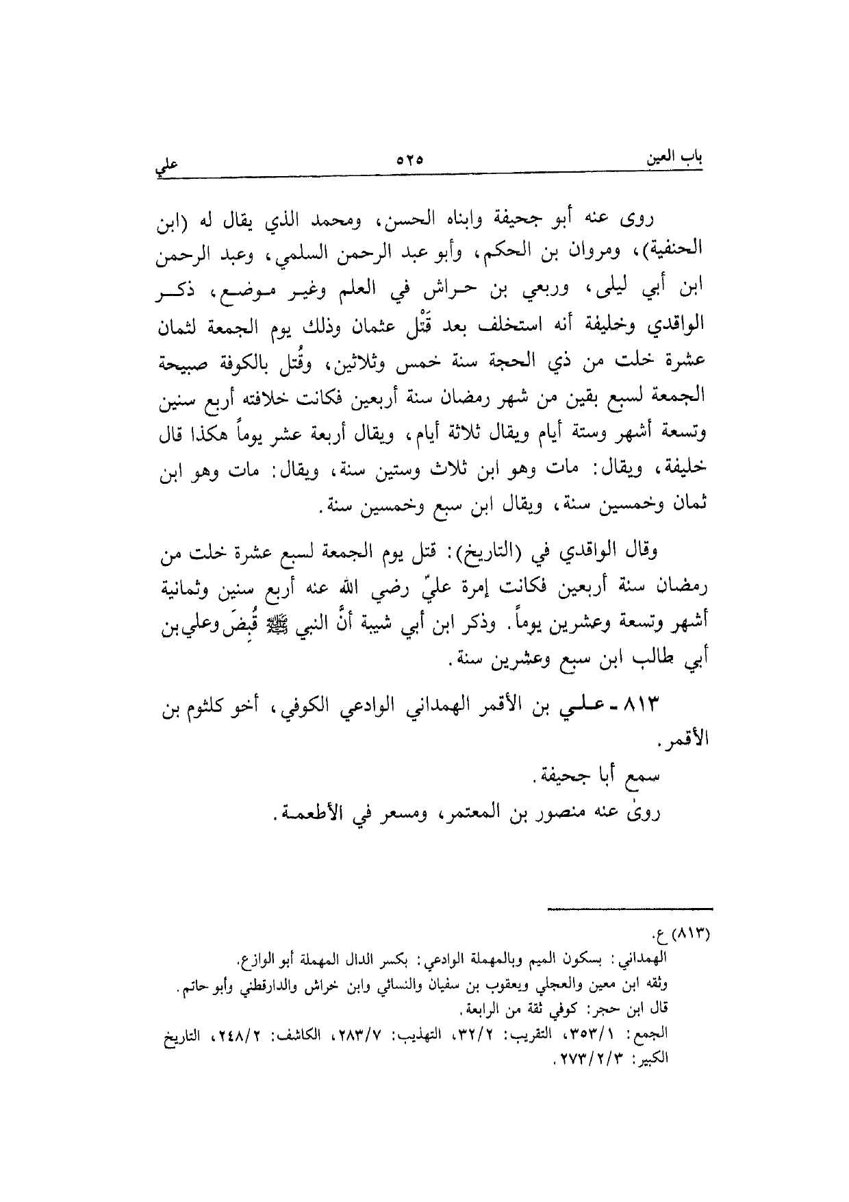 813 - عَلّي بن الْأَقْمَر الْهَمدَانِي الوادعي الْكُوفِي أَخُو كُلْثُوم بن الْأَقْمَر سمع أَبَا جُحَيْفَة رَوَى عَنهُ مَنْصُور بن الْمُعْتَمِر ومسعر فِي الْأَطْعِمَة