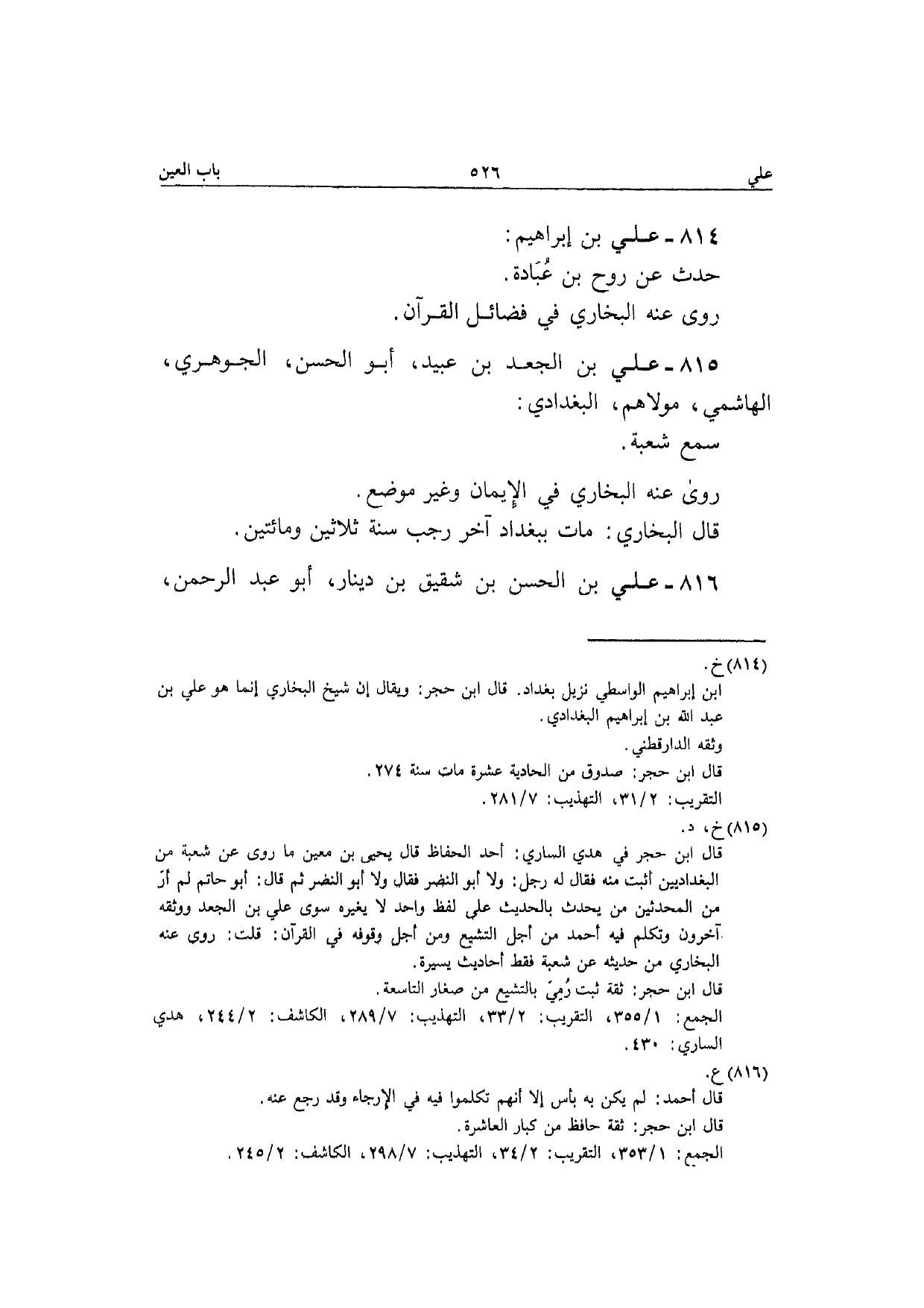 814 - عَلّي بن إِبْرَاهِيم حدث عَن روح بن عبَادَة رَوَى عَنهُ البُخَارِيّ فِي فَضَائِل الْقُرْآن