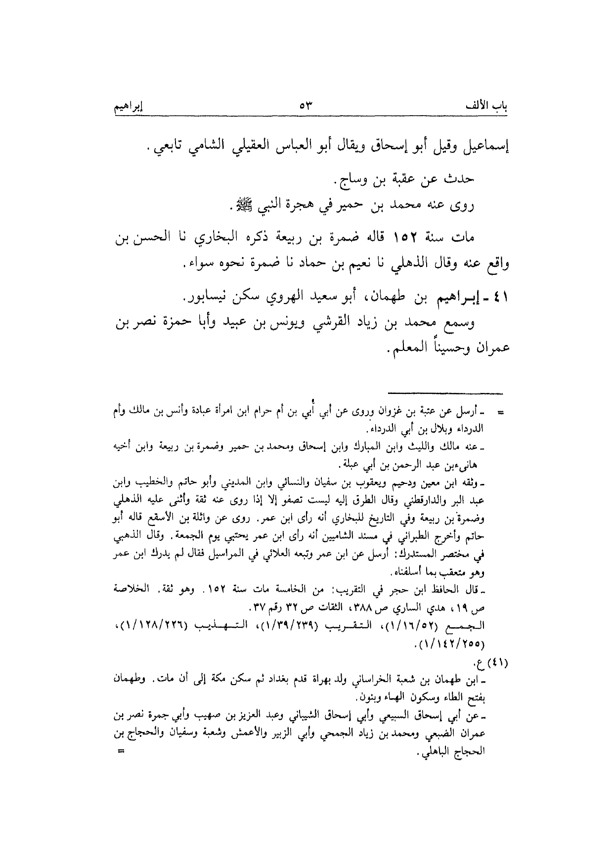 41 - إِبْرَاهِيم بن طهْمَان أَبُو سعيد الْهَرَوِيّ سكن نيسابور وَسمع مُحَمَّد بن زِيَاد الْقرشِي وَيُونُس بن عبيد وَأَبا حَمْزَة نصر بن عمرَان وَحسَيْنا الْمعلم