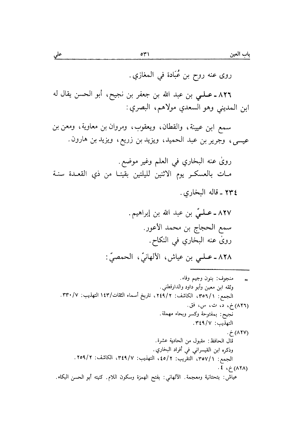 826 - عَلّي بن عبد الله بن جَعْفَر بن نجيح أَبُو الْحسن يُقَال لَهُ ابْن الْمَدِينِيّ وَهُوَ السَّعْدِيّ مَوْلَاهُم الْبَصْرِيّ سمع ابْن عُيَيْنَة وَالْقطَّان وَيَعْقُوب ومروان بن مُعَاوِيَة ومعن بن عِيسَى وَجَرِير بن عبد الحميد وَيزِيد بن زُرَيْع وَيزِيد بن هَارُون رَوَى عَنهُ البُخَارِيّ فِي الْعلم وَغير مَوضِع مَاتَ بالعسكر يَوْم الْإِثْنَيْنِ لليلتين بَقِيَتَا من ذِي الْقعدَة سنة 234 قَالَه البُخَارِيّ