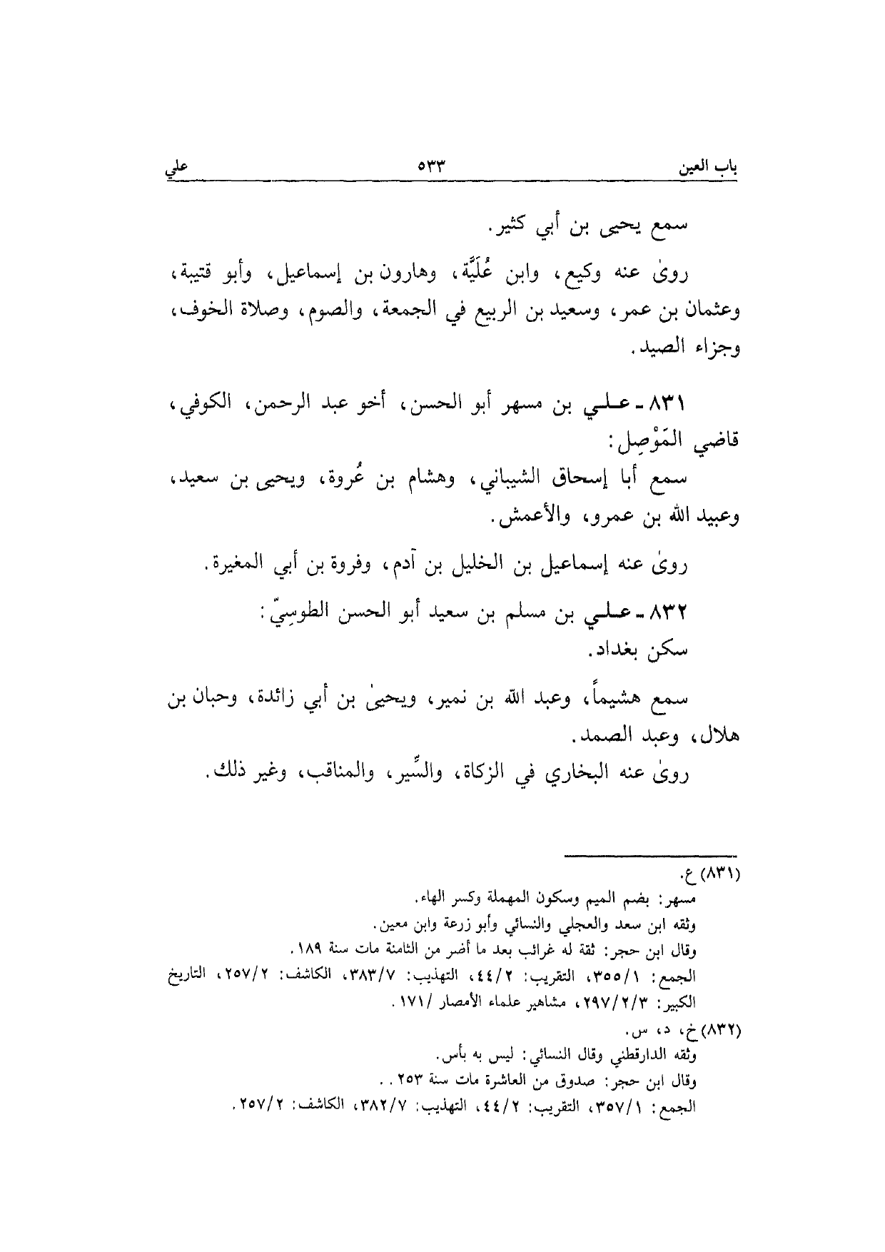 831 - عَلّي بن مسْهر أَبُو الْحسن أَخُو عبد الرَّحْمَن الْكُوفِي قَاضِي الْموصل سمع أَبَا إِسْحَاق الشَّيْبَانِيّ وَهِشَام بن عُرْوَة وَيَحْيَى بن سعيد وَعبيد الله بن عَمْرو وَالْأَعْمَش رَوَى عَن إِسْمَاعِيل بن الْخَلِيل بن آدم وفروة بن أبي الْمُغيرَة