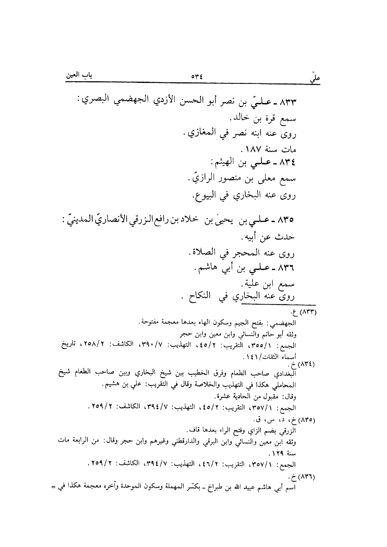 834 - عَلّي بن الْهَيْثَم سمع مُعلى بن مَنْصُور الرَّازِيّ رَوَى عَنهُ البُخَارِيّ فِي الْبيُوع
