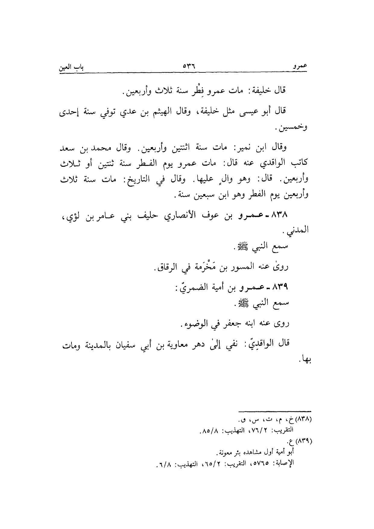 839 - عَمْرو بن أُميَّة الضمرِي سمع النَّبِي صَلَّى الله عَلَيْهِ وَسلم رَوَى عَنهُ ابْنه جَعْفَر فِي الْوضُوء قَالَ الْوَاقِدِيّ نَفَى إِلَى دهر مُعَاوِيَة بن أبي سُفْيَان بِالْمَدِينَةِ وَمَات بهَا