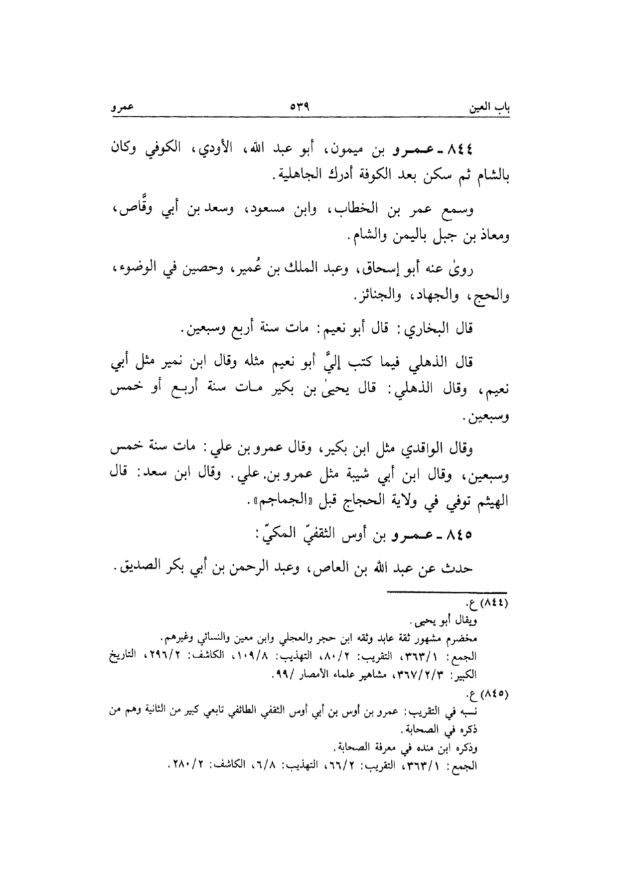 844 - عَمْرو بن مَيْمُون أَبُو عبد الله الأودي الْكُوفِي وَكَانَ بِالشَّام ثمَّ سكن بعد الْكُوفَة أدْرك الْجَاهِلِيَّة وَسمع عمر بن الْخطاب وَابْن مَسْعُود وَسعد بن أبي وَقاص ومعاذ بن جبل بِالْيمن وَالشَّام رَوَى عَنهُ أَبُو إِسْحَاق وَعبد الْملك بن عُمَيْر وحصين فِي الْوضُوء وَالْحج وَالْجهَاد والجنائز قَالَ البُخَارِيّ قَالَ أَبُو نعيم مَاتَ سنة أَربع وَسبعين قَالَ الذهلي فِيمَا كتب إِلَيّ أَبُو نعيم مثله وَقَالَ ابْن نمير مثل أبي نعيم وَقَالَ الذهلي قَالَ يَحْيَى بن بكير مَاتَ سنة أَربع أَو خمس وَسبعين وَقَالَ الْوَاقِدِيّ مثل ابْن بكير وَقَالَ عَمْرو بن عَلّي مَاتَ سنة خمس وَسبعين وَقَالَ ابْن أبي شيبَة مثل عَمْرو بن عَلّي وَقَالَ ابْن سعد قَالَ الْهَيْثَم توفّي فِي ولَايَة الْحجَّاج قبل ((الجماجم))