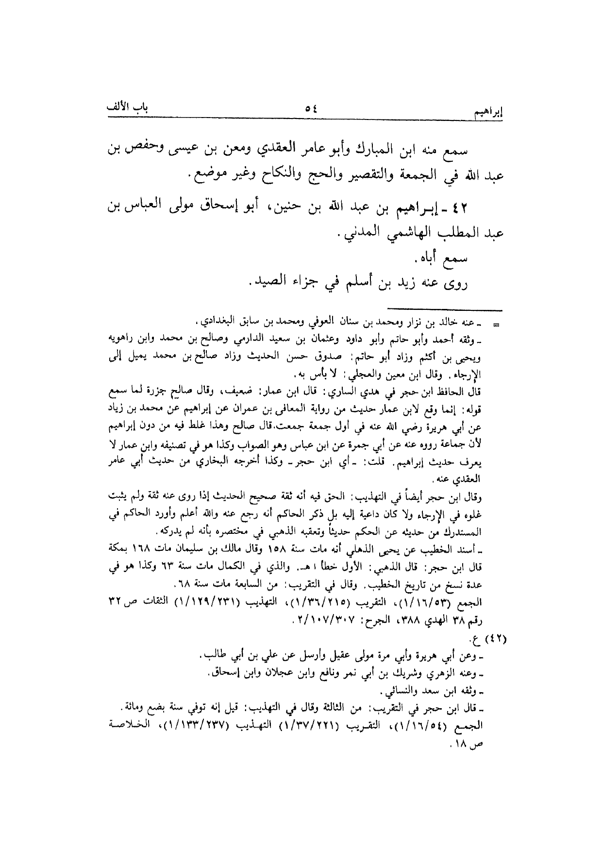 42 - إِبْرَاهِيم بن عبد الله بن حنين أَبُو إِسْحَاق مولَى الْعَبَّاس بن عبد الْمطلب الْهَاشِمِي الْمدنِي سمع أَبَاهُ رَوَى عَنهُ زيد بن أسلم فِي جَزَاء الصَّيْد