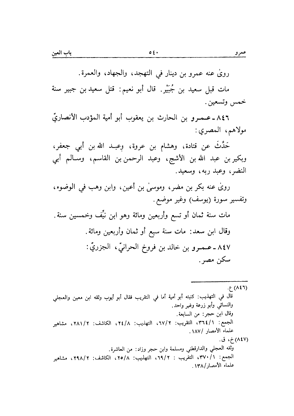 846 - عَمْرو بن الْحَارِث بن يَعْقُوب أَبُو أُميَّة الْمُؤَدب الْأنْصَارِيّ مَوْلَاهُم الْمصْرِيّ حدث عَن قَتَادَة وَهِشَام بن عُرْوَة وَعبد الله بن أبي جَعْفَر وَبُكَيْر بن عبد الله بن الْأَشَج وَعبد الرَّحْمَن بن الْقَاسِم وَسَالم أبي النَّضر وعبدربه وَسَعِيد رَوَى عَنهُ بكر بن مُضر ومُوسَى بن أعين وَابْن وهب فِي الْوضُوء وَتَفْسِير سُورَة (يُوسُف) وَغير مَوضِع مَاتَ سنة ثَمَان أَو تسع وَأَرْبَعين وَمِائَة وَهُوَ ابْن نَيف وَخمسين سنة وَقَالَ ابْن سعد مَاتَ سنة سبع أَو ثَمَان وَأَرْبَعين وَمِائَة