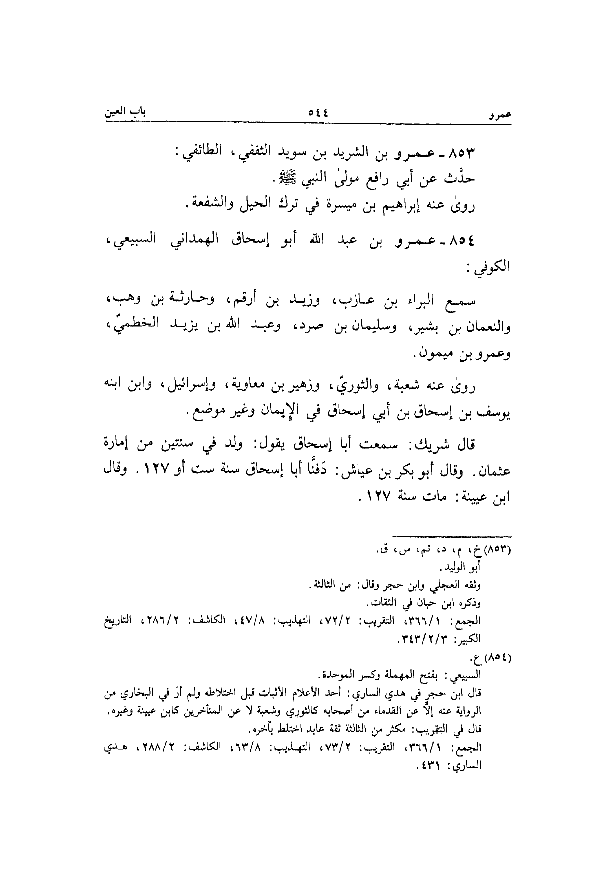 854 - عَمْرو بن عبد الله أَبُو إِسْحَاق الْهَمدَانِي السبيعِي الْكُوفِي سمع الْبَراء بن عَازِب وَزيد بن أَرقم وحارثة بن وهب والنعمان بن بشير وَسليمَان بن صرد وَعبد الله بن يزِيد الخطمي وَعَمْرو بن مَيْمُون رَوَى عَنهُ شُعْبَة وَالثَّوْري وَزُهَيْر بن مُعَاوِيَة وَإِسْرَائِيل وَابْن ابْنه يُوسُف بن إِسْحَاق بن أبي إِسْحَاق فِي الْإِيمَان وَغير مَوضِع قَالَ شريك سَمِعت أَبَا إِسْحَاق يَقُول ولد فِي سنتَيْن من إِمَارَة عُثْمَان وَقَالَ أَبُو بكر بن عَيَّاش دفنا أَبَا إِسْحَاق سنة سِتّ أَو 127 وَقَالَ ابْن عُيَيْنَة مَاتَ سنة 127