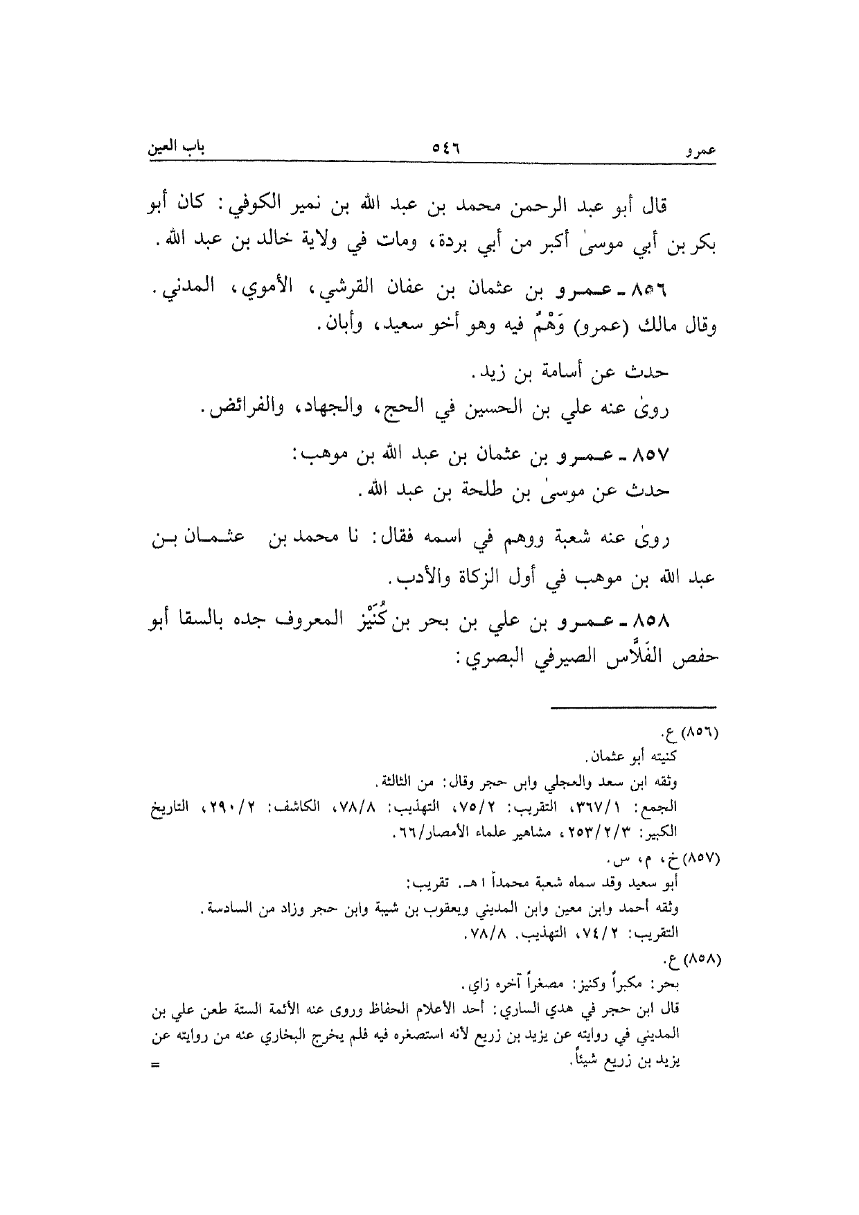 856 - عَمْرو بن عُثْمَان بن عَفَّان الْقرشِي الْأمَوِي الْمدنِي وَقَالَ مَالك (عَمْرو) وهم فِيهِ وَهُوَ أَخُو سعيد وَأَبَان حدث عَن أُسَامَة بن زيد رَوَى عَنهُ عَلّي بن الْحُسَيْن فِي الْحَج وَالْجهَاد والفرائض