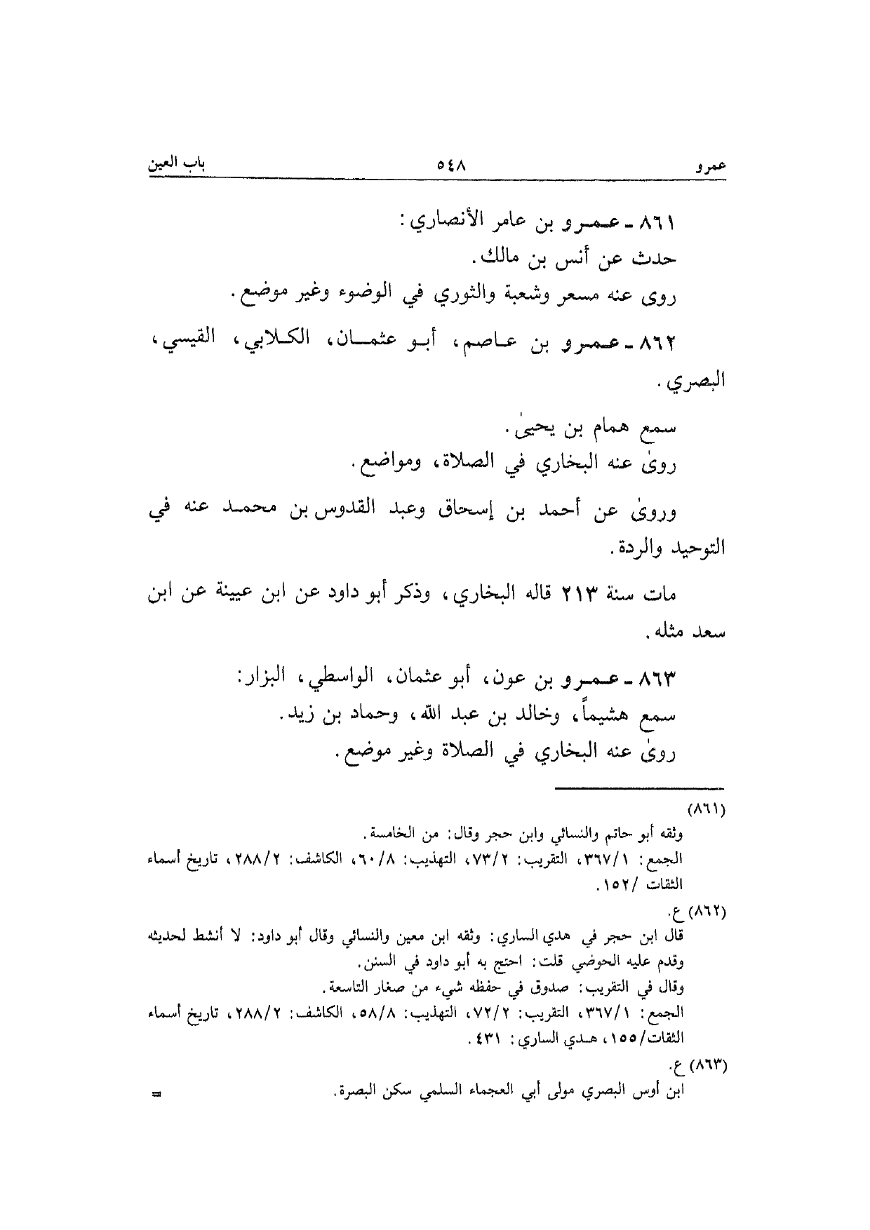 862 - عَمْرو بن عَاصِم أَبُو عُثْمَان الْكلابِي الْقَيْسِي الْبَصْرِيّ سمع همام بن يَحْيَى رَوَى عَنهُ البُخَارِيّ فِي الصَّلَاة ومواضع وَرَوَى عَن أَحْمد بن إِسْحَاق وَعبد القدوس بن مُحَمَّد عَنهُ فِي التَّوْحِيد وَالرِّدَّة مَاتَ سنة 213 قَالَه البُخَارِيّ وَذكر أَبُو دَاوُد عَن ابْن عُيَيْنَة عَن ابْن سعد مثله