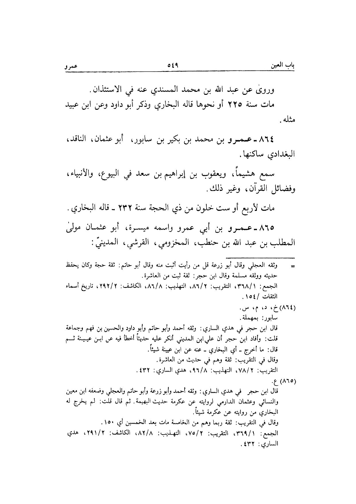 864 - عَمْرو بن مُحَمَّد بن بكير بن سَابُور أَبُو عُثْمَان النَّاقِد الْبَغْدَادِيّ ساكنها سمع هشيما وَيَعْقُوب بن إِبْرَاهِيم بن سعد فِي الْبيُوع والأنبياء وفضائل الْقُرْآن وَغير ذَلِك مَاتَ لأَرْبَع أَو سِتّ خلون من ذِي الْحجَّة سنة 232 قَالَه البُخَارِيّ