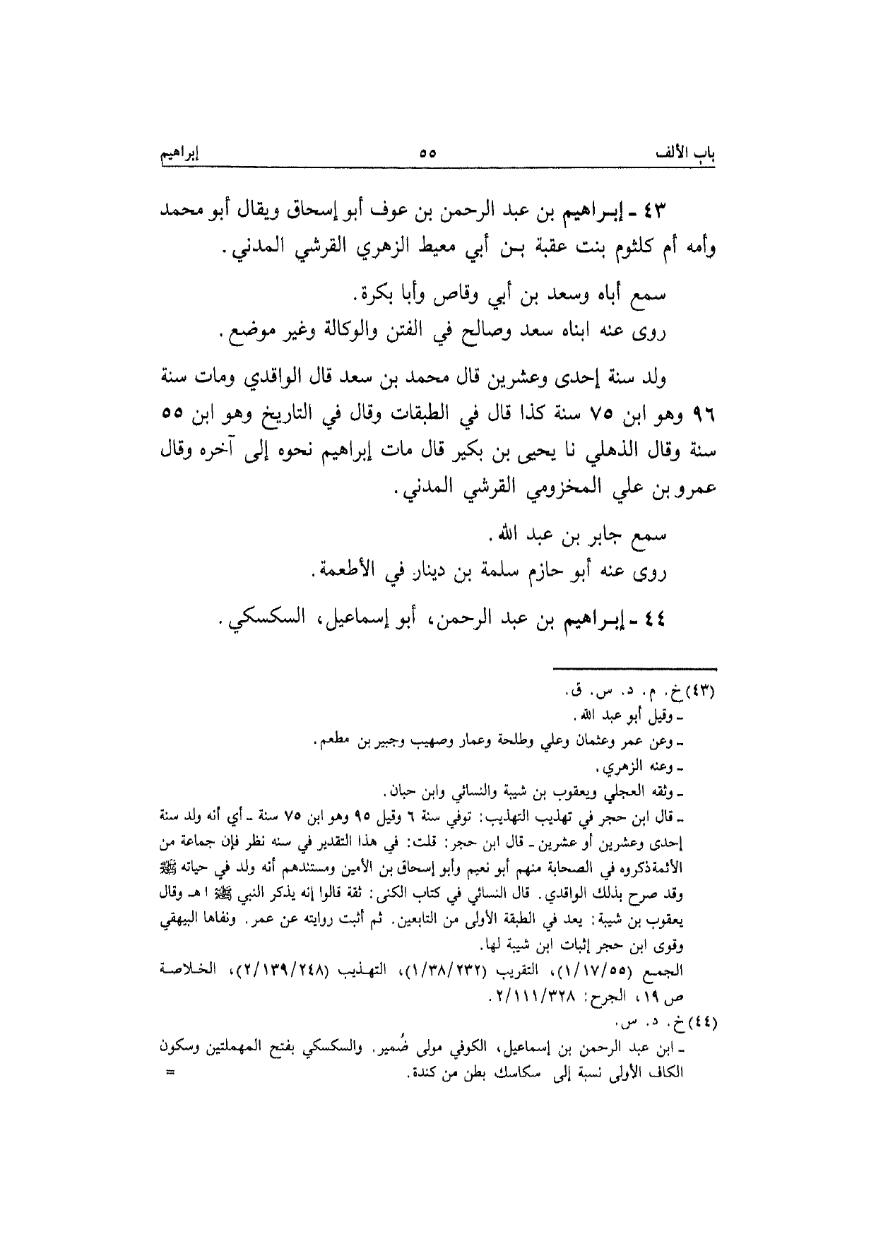 43 - إِبْرَاهِيم بن عبد الرَّحْمَن بن عَوْف أَبُو إِسْحَاق وَيُقَال أَبُو مُحَمَّد وَأمه أم كُلْثُوم بنت عقبَة بن أبي معيط الزُّهْرِيّ الْقرشِي الْمدنِي سمع أَبَاهُ وَسعد بن أبي وَقاص وَأَبا بكرَة رَوَى عَنهُ ابناه سعد وَصَالح فِي الْفِتَن وَالْوكَالَة وَغير مَوضِع ولد سنة إِحْدَى وَعشْرين قَالَ مُحَمَّد بن سعد قَالَ الْوَاقِدِيّ وَمَات سنة 96 وَهُوَ ابْن 75 سنة كَذَا قَالَ فِي الطَّبَقَات وَقَالَ فِي التَّارِيخ وَهُوَ ابْن 55 سنة وَقَالَ الذهلي نَا يَحْيَى بن بكير قَالَ مَاتَ إِبْرَاهِيم نَحوه إِلَى آخِره وَقَالَ عَمْرو بن عَلّي المَخْزُومِي الْقرشِي الْمدنِي سمع جَابر بن عبد الله رَوَى عَنهُ أَبُو حَازِم سَلمَة بن دِينَار فِي الْأَطْعِمَة