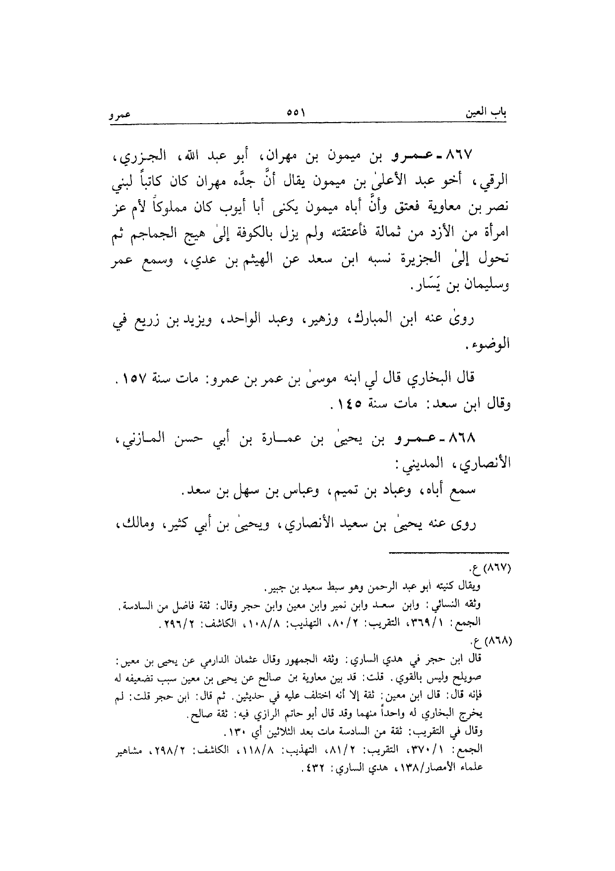 867 - عَمْرو بن مَيْمُون بن مهْرَان أَبُو عبد الله الْجَزرِي الرقي أَخُو عبد الْأَعْلَى بن مَيْمُون يُقَال أَن جده مهْرَان كَانَ كَاتبا لبني نصر بن مُعَاوِيَة فَعتق وَأَن أَبَاهُ مَيْمُون يكنى أَبَا أَيُّوب كَانَ مَمْلُوكا لأم عز امْرَأَة من الأزد من ثمالة فأعتقته وَلم يزل بِالْكُوفَةِ إِلَى هيج الجماجم ثمَّ تحول إِلَى الجزيرة نسبه ابْن سعد عَن الْهَيْثَم بن عدي وَسمع عمر وَسليمَان بن يسَار رَوَى عَنهُ ابْن الْمُبَارك وَزُهَيْر وَعبد الْوَاحِد وَيزِيد بن زُرَيْع فِي الْوضُوء قَالَ البُخَارِيّ قَالَ لي ابْنه مُوسَى بن عمر بن عَمْرو مَاتَ سنة 157 وَقَالَ ابْن سعد مَاتَ سنة 145