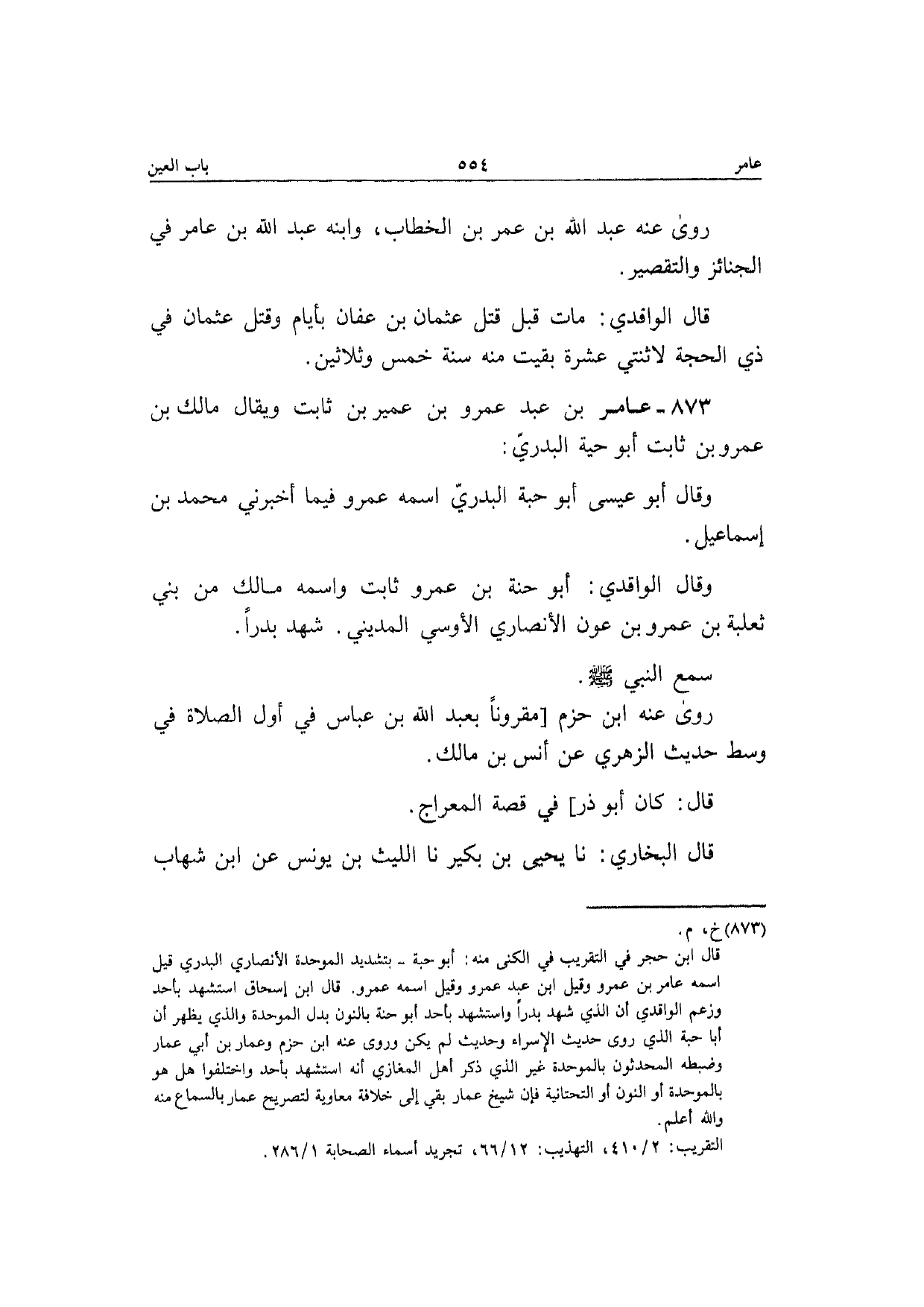 873 - عَامر بن عبد عَمْرو بن عُمَيْر بن ثَابت وَيُقَال مَالك بن عَمْرو بن ثَابت أَبُو حَيَّة البدري وَقَالَ أَبُو عِيسَى أَبُو حَبَّة البدري اسْمه عَمْرو فِيمَا أَخْبرنِي مُحَمَّد بن إِسْمَاعِيل وَقَالَ الْوَاقِدِيّ أَبُو حنة بن عَمْرو ثَابت واسْمه مَالك من بني ثَعْلَبَة بن عَمْرو بن عون الْأنْصَارِيّ الأوسي الْمَدِينِيّ شهد بَدْرًا سمع النَّبِي صَلَّى الله عَلَيْهِ وَسلم رَوَى عَنهُ ابْن حزم (مَقْرُونا بِعَبْد الله بن عَبَّاس فِي أول الصَّلَاة فِي وسط حَدِيث الزُّهْرِيّ عَن أنس بن مَالك قَالَ كَانَ أَبُو ذَر) فِي قصَّة الْمِعْرَاج قَالَ البُخَارِيّ نَا يَحْيَى بن بكير نَا اللَّيْث بن يُونُس عَن ابْن شهَاب