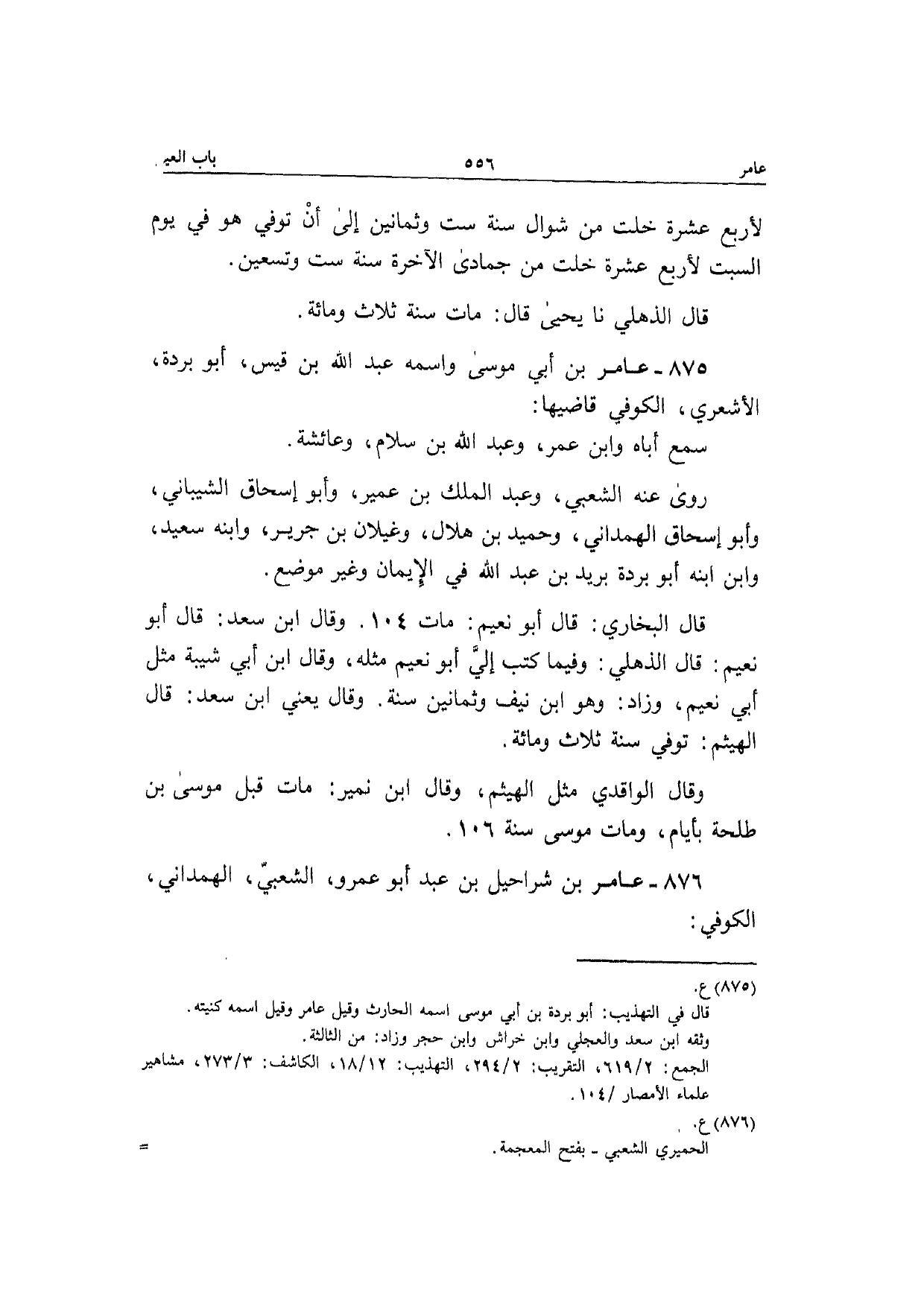 875 - عَامر بن أبي مُوسَى واسْمه عبد الله بن قيس أَبُو بردة الْأَشْعَرِيّ الْكُوفِي قاضيها سمع أَبَاهُ وَابْن عمر وَعبد الله بن سَلام وَعَائِشَة رَوَى عَنهُ الشّعبِيّ وَعبد الْملك بن عُمَيْر وَأَبُو إِسْحَاق الشيبابي وَأَبُو إِسْحَاق الْهَمدَانِي وَحميد بن هِلَال وغيلان بن جرير وَابْنه سعيد وَابْن ابْنه أَبُو بردة بريد بن عبد الله فِي الْإِيمَان وَغير مَوضِع قَالَ البُخَارِيّ قَالَ أَبُو نعيم مَاتَ 104 وَقَالَ ابْن سعد قَالَ أَبُو نعيم قَالَ الذهلي وَفِيمَا كتب إِلَيّ أَبُو نعيم مثله وَقَالَ ابْن أبي شيبَة مثل أبي نعيم وَزَاد وَهُوَ ابْن نَيف وَثَمَانِينَ سنة وَقَالَ يَعْنِي ابْن سعد قَالَ الْهَيْثَم توفّي سنة ثَلَاث وَمِائَة وَقَالَ الْوَاقِدِيّ مثل الْهَيْثَم وَقَالَ ابْن نمير مَاتَ قبل مُوسَى بن طَلْحَة بأيام وَمَات مُوسَى سنة 106
